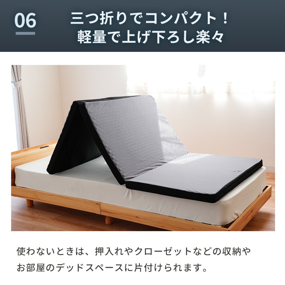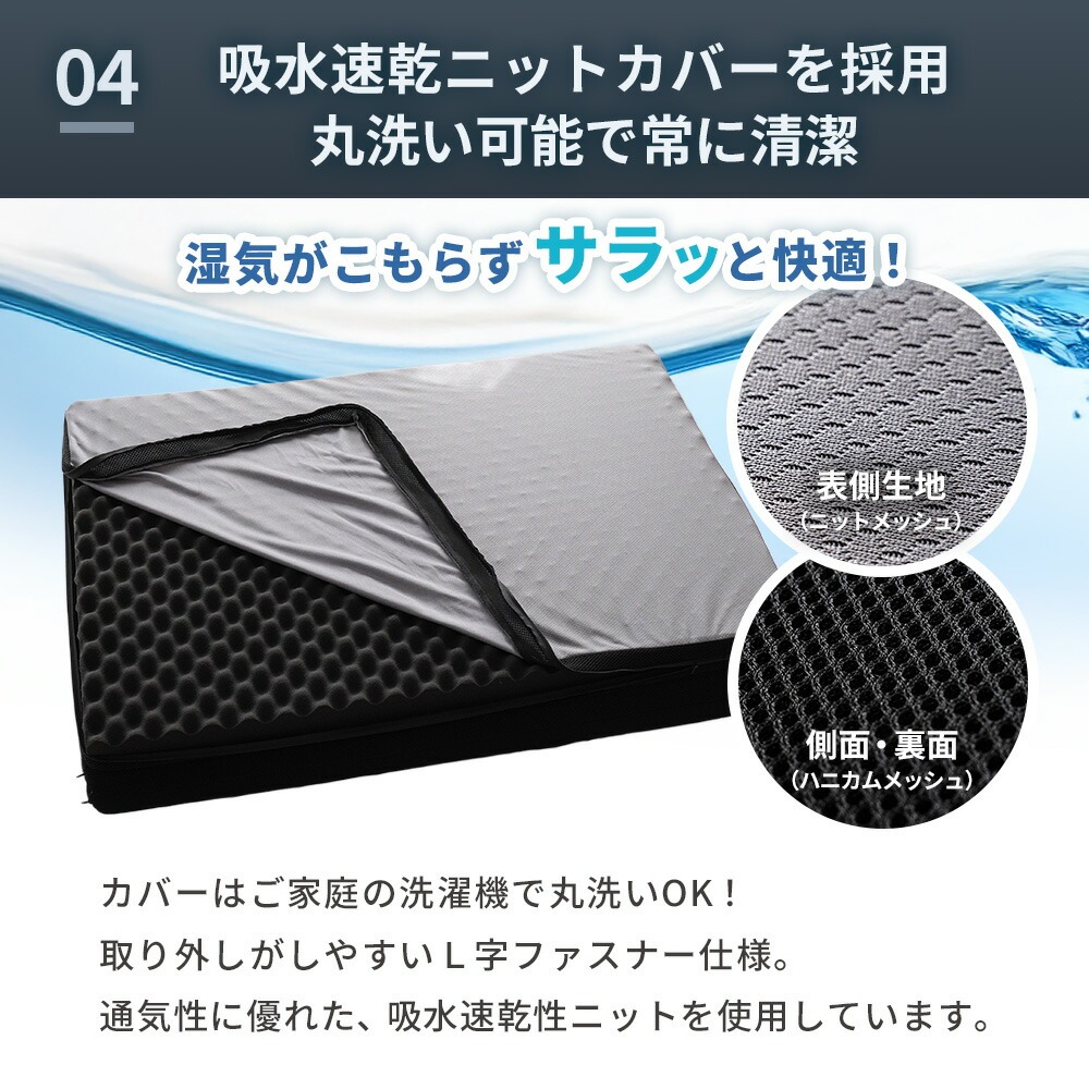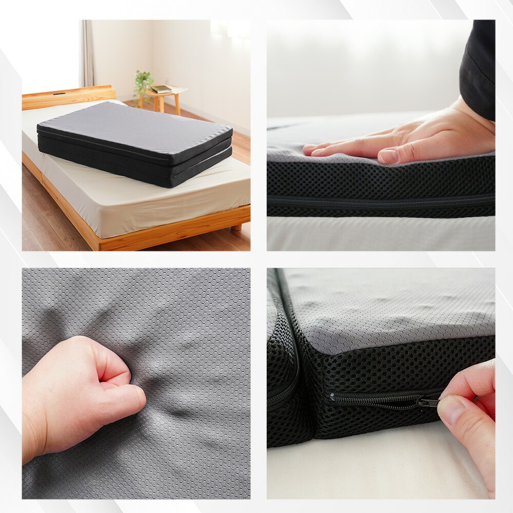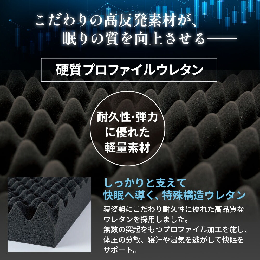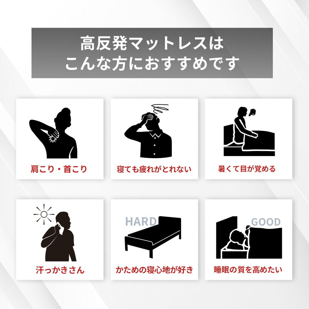 | ・高い反発性と弾力性で寝返り促進 “寝返り”には、血流促進や体温調節、日中の活動で歪んだ背骨を調整する働きがあります。 240 Nクラスは一般的な高反発(140?180 N)よりさらに硬めで、よりフラットな寝心地。 高い弾力性と押し上げる力により全身の体圧が分散されるため、身体の1か所への負担集中を軽減。 カバーはご家庭の洗濯機で丸洗いOK! 側生地ファスナーの開け締めでウレタンの取り出しが可能。 使わないときは、押入れやクローゼットなどの収納やお部屋のデッドスペースに片付けられます。 | |