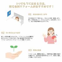 | リフォーム対象のお布団について | 本サービスは、羽毛布団専用のリフォームとなります。羽毛布団とは、中身がダウン50%以上の布団のことをいいます。 以下に該当する場合はリフォームできません。 ・羽毛布団以外(ダウン50%未満のもの) ・本掛け以外(ダウンケット、合掛け、2枚合わせ、羽毛量1.1kg以下の羽毛布団) ・綿・ウール・ポリエステルが中わたに使用されているもの ・アイダーダッグダウンを使用したもの ※詰めものの50%より多く羽根(フェザー)が含まれるものは、「羽根ふとん」です。リフォームできません。触った際に、中に固い芯のようなものを全体的に感じたら、羽根ふとんの可能性があります。弊社でお預かり後に、返送させていただく場合がございますので予めご了承ください。 |