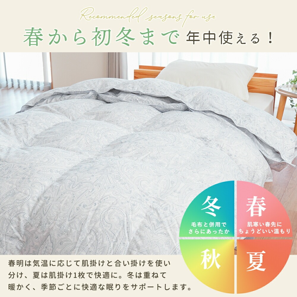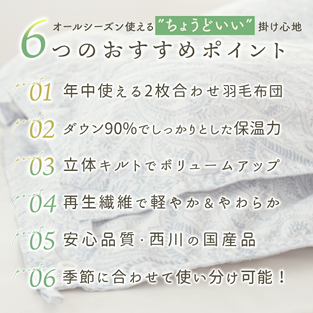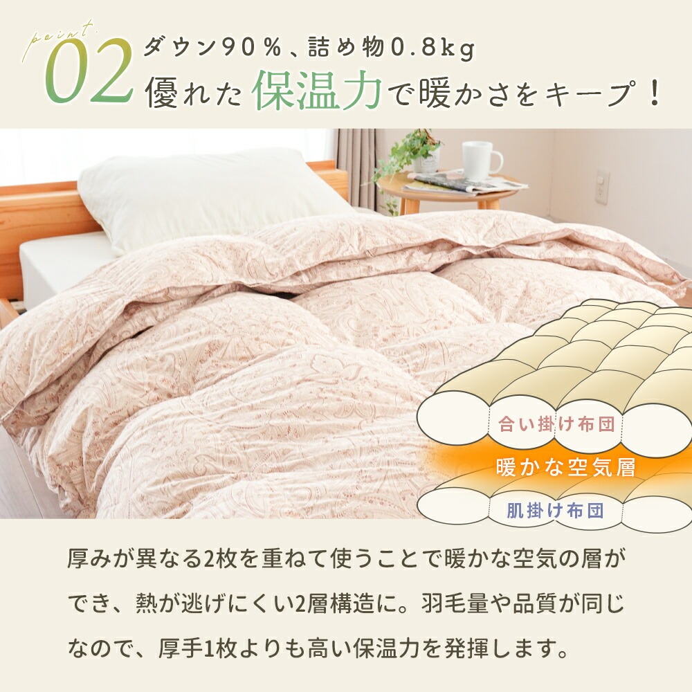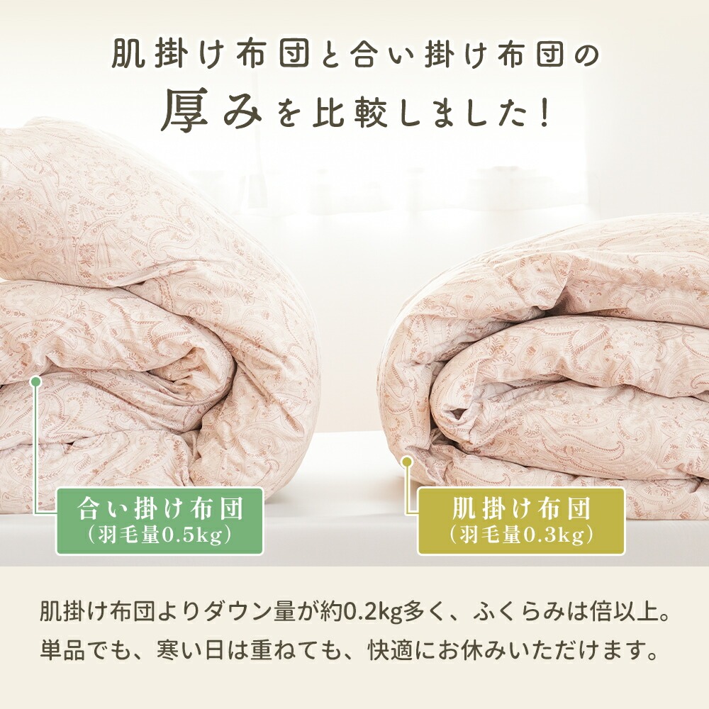 | ・掛け布団のお悩みともこれでさようなら!年中使えるちょうどいい羽毛布団 合い掛け布団と肌掛け布団を重ねることで、冬も暖かく、季節に応じて使い分けすることができます。1年中快適に使える便利な布団で、掛け布団のお悩みも今日で解決! ・ダウン90%で詰め物量0.8kg。優れた保温力で暖かさをキープ厚みが異なる2枚を重ねて使うことで暖かな空気の層ができ、熱が逃げにくい2層構造に。羽毛量や品質が同じなので、厚手1枚よりも高い保温力で発揮します。 ・暖かさを逃がさない作り。立体キルトでボリュームアップ羽毛の持つふくらむ力を存分に発揮するため、羽毛の小部屋を立体的につくったキルトです。平面キルトの縫い目部分の無駄をなくし、暖かさを逃がしません。 ・環境に配慮した再生繊維生地。軽やか&柔らかさをプラス軽くて柔らかな再生繊維(リヨセル)に、丈夫なポリエステルを配合し、さらなる耐久性をプラスしました。優れた吸湿性と通気性を兼ね備えました。 ・安心安全の高品質な国内品、老舗メーカー・西川製品品汁にこだわりたい方も安心。日本有数の寝具メーカー「西川」の製品です。長い歴史の中で、積み重ねられたその技術は、高い品質と信頼があります。 ・眠っている間もズレずに安心!2枚をつなげるホック付き眠っている間に布団がズレてしまわないか不安…という方も安心!布団には組み合わせて使えるホックボタン付きです。しっかりパチッとするだけなので簡単に付け外しができます。 ・シーンや季節に合わせて快適に、選べる3パターンの使い分け肌掛け・合い掛けの2枚合わせで、3通りの使い方が可能。季節の移り変わりやお部屋の環境に合わせて、1年中快適にお使いいただける便利なお布団です。 | |