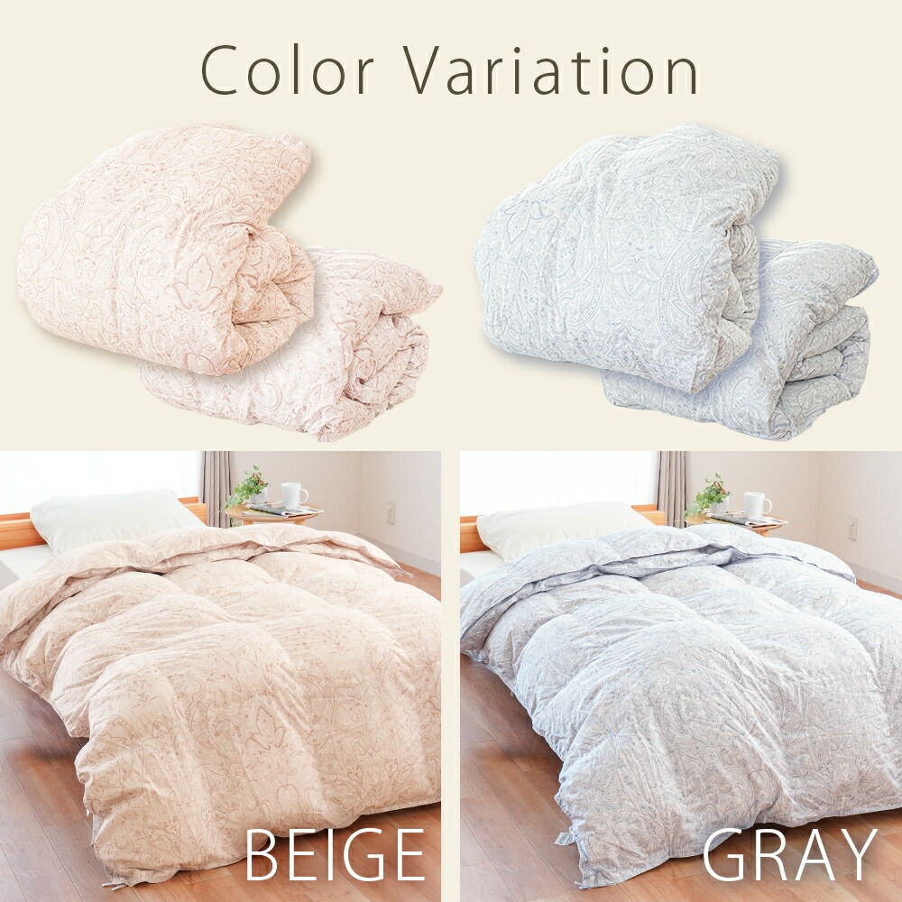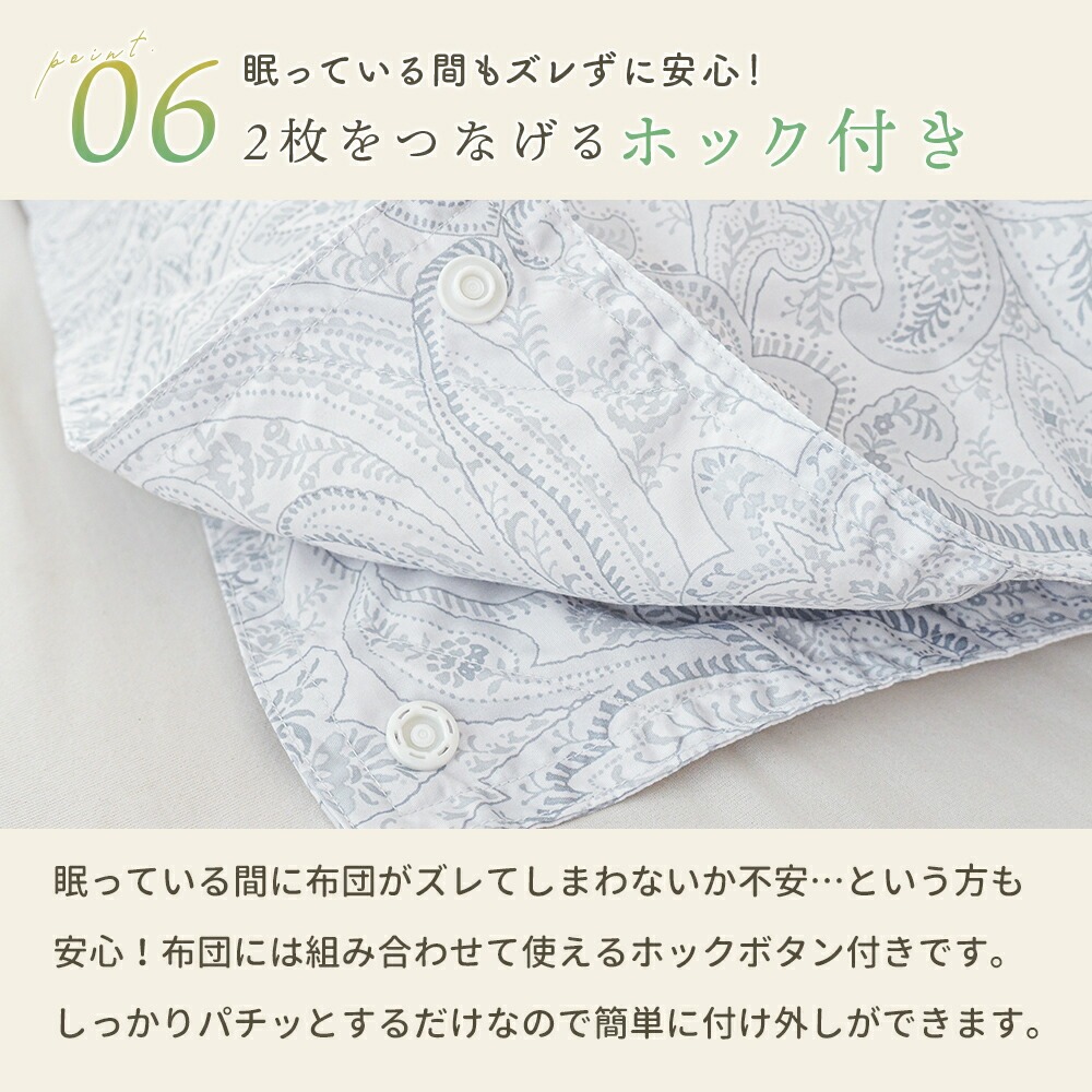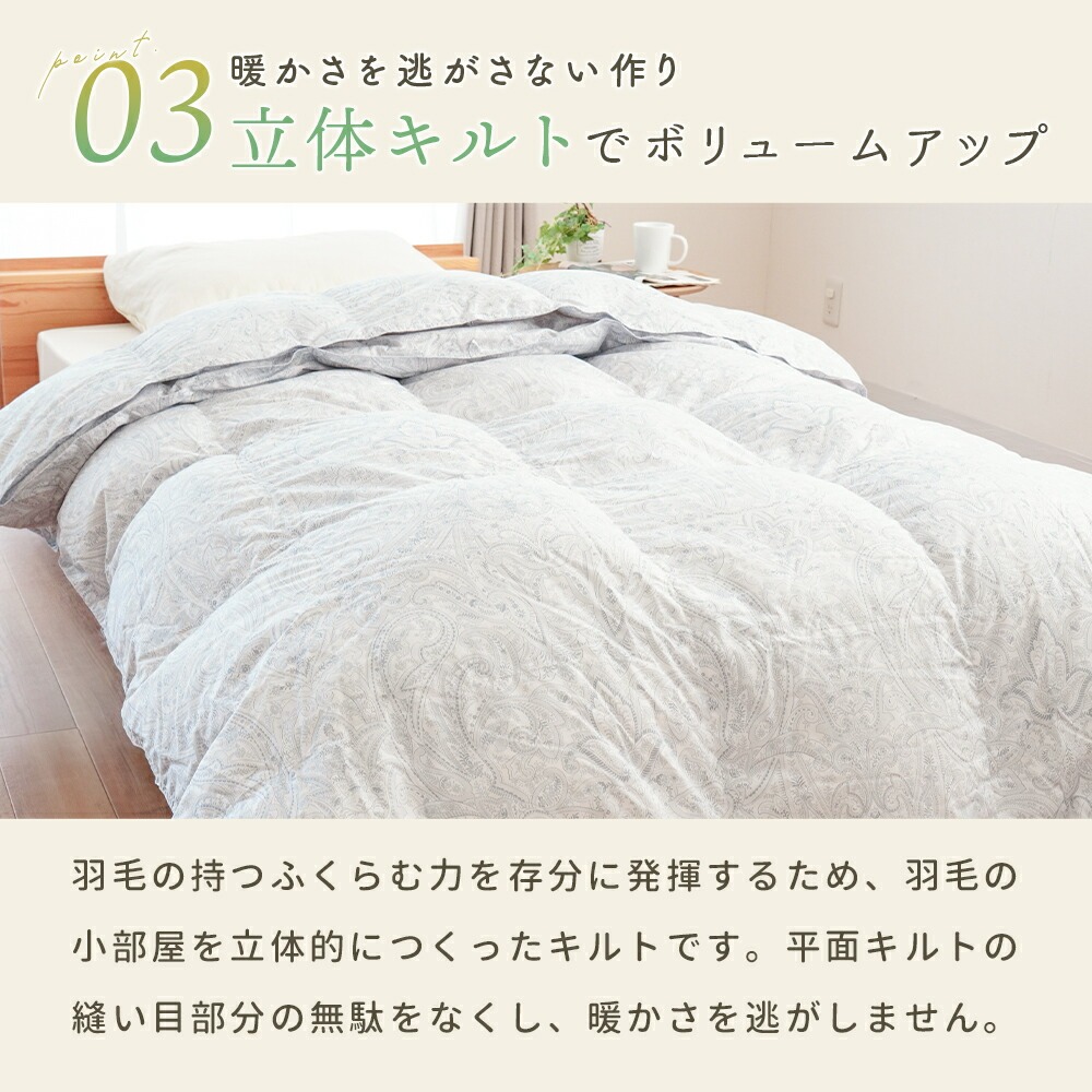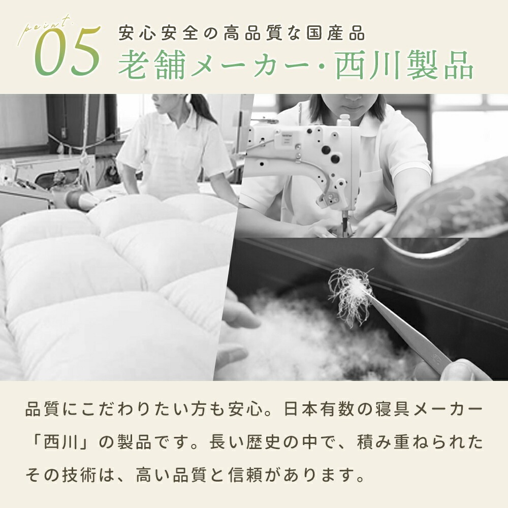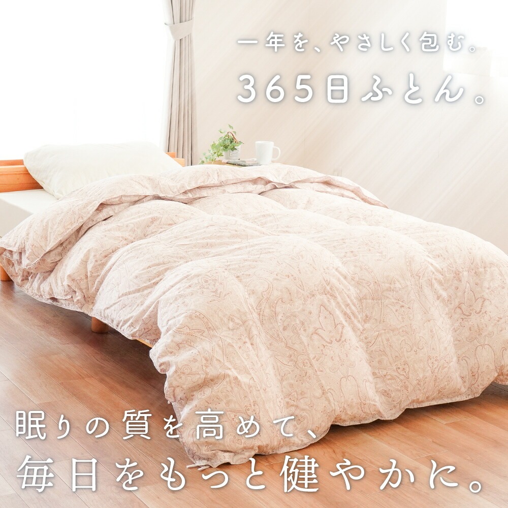 | ・掛け布団のお悩みともこれでさようなら!年中使えるちょうどいい羽毛布団 合い掛け布団と肌掛け布団を重ねることで、冬も暖かく、季節に応じて使い分けすることができます。1年中快適に使える便利な布団で、掛け布団のお悩みも今日で解決! ・ダウン90%で詰め物量0.8kg。優れた保温力で暖かさをキープ厚みが異なる2枚を重ねて使うことで暖かな空気の層ができ、熱が逃げにくい2層構造に。羽毛量や品質が同じなので、厚手1枚よりも高い保温力で発揮します。 ・暖かさを逃がさない作り。立体キルトでボリュームアップ羽毛の持つふくらむ力を存分に発揮するため、羽毛の小部屋を立体的につくったキルトです。平面キルトの縫い目部分の無駄をなくし、暖かさを逃がしません。 ・環境に配慮した再生繊維生地。軽やか&柔らかさをプラス軽くて柔らかな再生繊維(リヨセル)に、丈夫なポリエステルを配合し、さらなる耐久性をプラスしました。優れた吸湿性と通気性を兼ね備えました。 ・安心安全の高品質な国内品、老舗メーカー・西川製品品汁にこだわりたい方も安心。日本有数の寝具メーカー「西川」の製品です。長い歴史の中で、積み重ねられたその技術は、高い品質と信頼があります。 ・眠っている間もズレずに安心!2枚をつなげるホック付き眠っている間に布団がズレてしまわないか不安…という方も安心!布団には組み合わせて使えるホックボタン付きです。しっかりパチッとするだけなので簡単に付け外しができます。 ・シーンや季節に合わせて快適に、選べる3パターンの使い分け肌掛け・合い掛けの2枚合わせで、3通りの使い方が可能。季節の移り変わりやお部屋の環境に合わせて、1年中快適にお使いいただける便利なお布団です。 | |