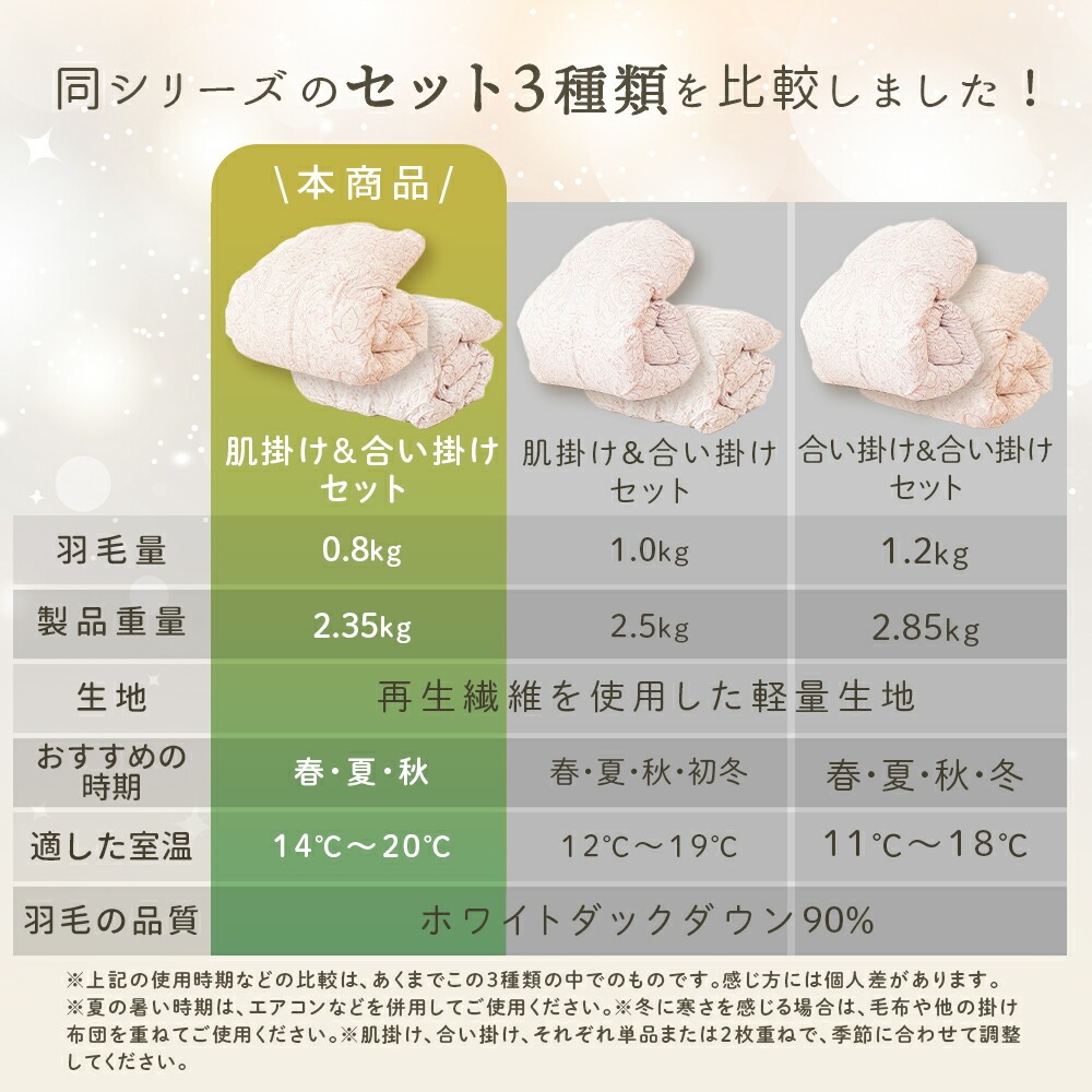| 2枚合わせ | 羽毛量0.8kg【当ページ】 | 羽毛量1.0kg | 羽毛量1.2kg |