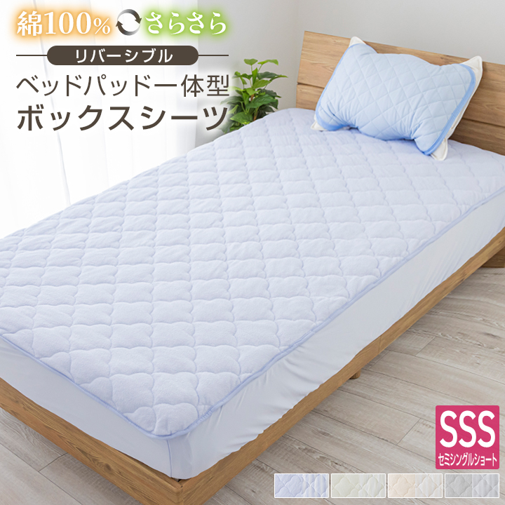 ボックスシーツ セミシングルショート 一体型 ベッドパッド一体型ボックスシーツ リバーシブル 綿100% ニットワッフル 敷きパッド 80×180cm ベッドパッド