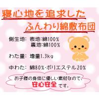 | 綿わた製品について 綿素材で無地の側生地の場合、そばかす等が見られます。 これらは綿生地の特徴になります。カビや汚れではございません。ご安心ください。 ページに記載されているサイズは商品の側生地サイズです。 仕上がりの商品は厚みがあるため、側生地サイズより縦横が小さくなります。 綿わたは無臭ではございません。植物性の臭いが湿気を含むと出やすくなるため、定期的に干すことをオススメします。 綿わたの製品はメーカー出荷の前にメーカーにて検針器をかけておりますが、ご注文後に当店でも再度、検針器をかけてから出荷を行います。 職人による手作りの商品です。 組成やサイズ等が記載された タグ等はついておりません。 ご了承の上お買い求めください。 綿わた商品はご家庭で洗えません。 お洗濯の際はクリーニング店に ご相談ください。 |