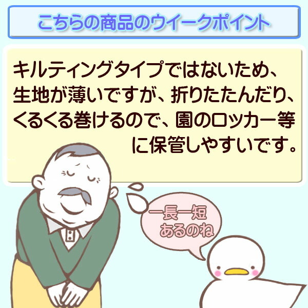| お昼寝掛け布団(80×110cm)1点+お昼寝敷き布団(70×120×3cm)1点+お昼寝枕(35×25cm)1点、計3点用となっております。 その他のサイズのお昼寝布団には非対応ですので、ご注意ください。 当店販売のお昼寝布団は、綿わたふとんを含めて全て対応可能ですので、ご安心ください。 お昼寝敷きふとんは、三つ折り曲げタイプは、ピッタリですが、二つ折り曲げタイプは、少しはみ出ます。 開閉形状が3ヶ所ヒモタイプで、ヒモを結ぶのに時間がかかりますが、ファスナーよりもヒモの方が長持ちする傾向にあります。 キルティングタイプではないため、生地が薄いですが、折りたたんだり、くるくる巻けるので、園のロッカー等に保管しやすいです。 |