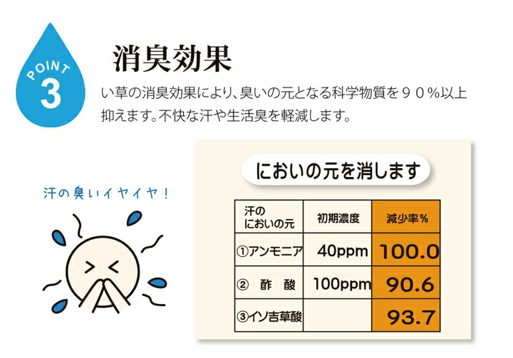 | ■寝っころがってテレビを見たり、折りたたんで腰かけたり、リビングでのお昼寝用に、などいろいろな使い方ができるフリーマットです。 ■い草には 1.綿の約3倍の吸湿性があり汗のじめじめを軽減します。 2.湿度の調整作用があり、蒸れにくく快適な就寝を促します。 3.汗のにおいの元となる化学物質を90%以上抑え、においを軽減します。 などの効果があります。 ■中材には固わた40mmを使用していますのでフローリングでも快適にご使用頂けます。 ■い草にヒバエッセンス加工を施しています。(抗菌防臭効果) |