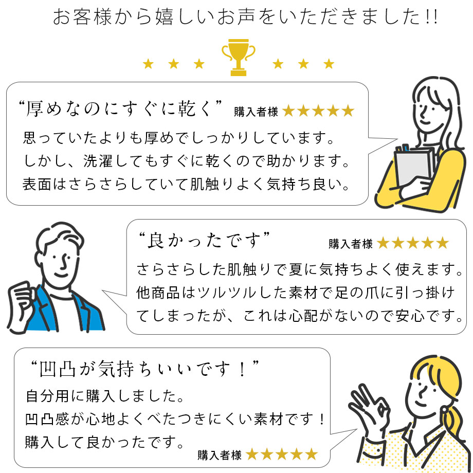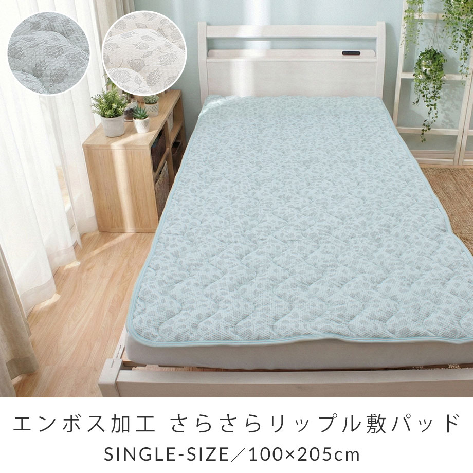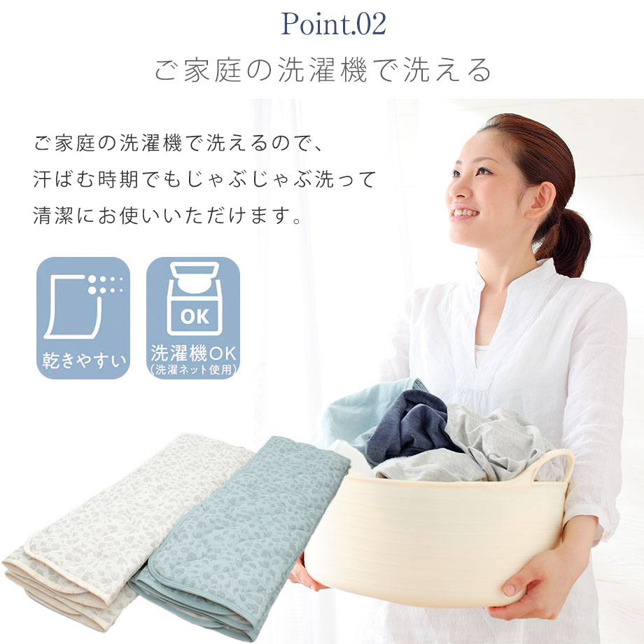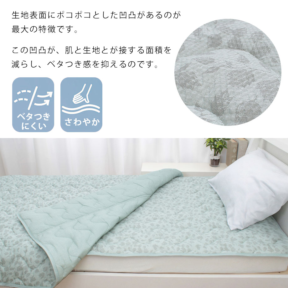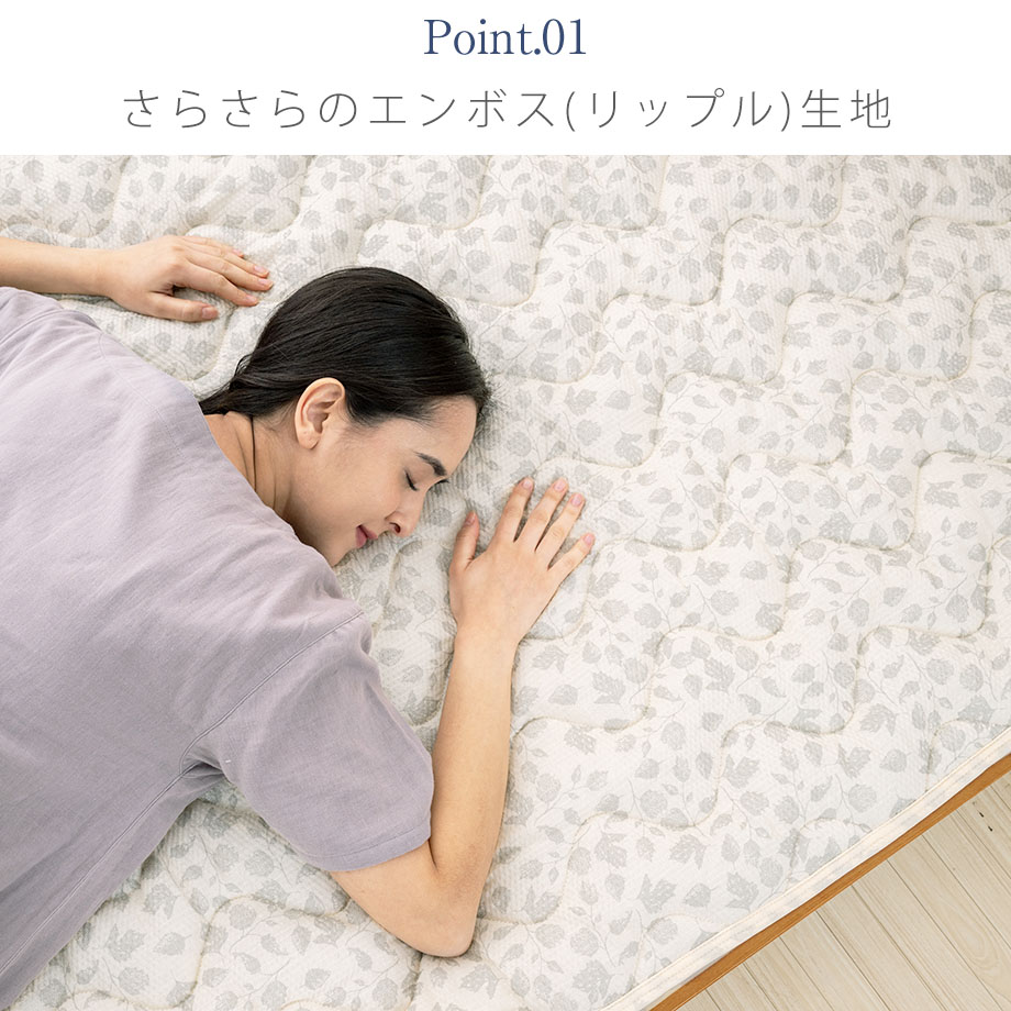 | ▼ こんな方におすすめ ▼ 夏の夜、背中のベタつきで目が覚めてしまう方 エアコンの冷えすぎが苦手で、自然な涼しさを求めたい方 汗っかきのお子様や、家族分の洗い替えを探している方 1.「ポコポコ」リップル加工で肌離れ抜群 生地表面に凹凸(エンボス)をつける「リップル加工」を施しました。 肌に触れる面積が少なくなるため、汗をかいてもベタつきにくく、朝まで「さらっ」とした爽やかな寝心地が続きます。 2.お洗濯してもすぐ乾く! ご家庭の洗濯機で丸洗いが可能です(洗濯ネット推奨)。 乾きやすい素材を使用しているため、汗をかきやすい夏場でもこまめに洗えて清潔さをキープできます。 3.ベッドも敷布団もOK!着脱簡単 四隅にゴムバンドが付いているため、敷き布団にもベッドマットレスにも対応。 付け外しがワンタッチで簡単なので、家事の時短にも貢献します。 |