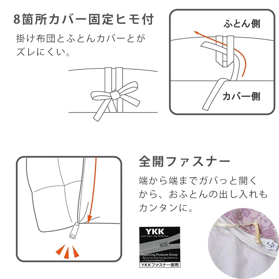 | 乾きやすくシワになりにくい速乾生地の掛け布団カバーです。 布団がズレにくい8ケ所ひも付き。 出し入れが簡単な全開ファスナーで、手軽に着脱して洗えるから、いつも清潔さを保てます。 |