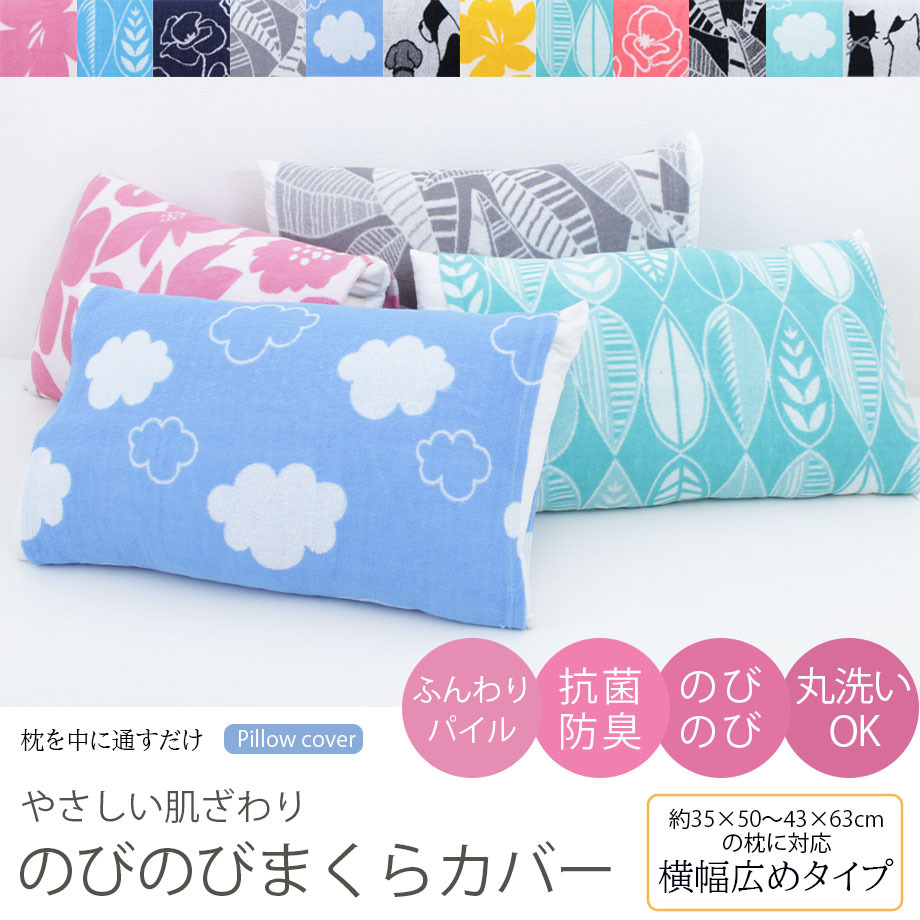| やさしい肌ざわりタオル生地の、のびのび枕カバーです。 よくのびる生地だから、色んな形にフィット! 筒式の枕カバーで取り付けも簡単! 横幅が広めの筒型カバーで43×63cmの枕がぴったりおさまるワイドタイプです。 |