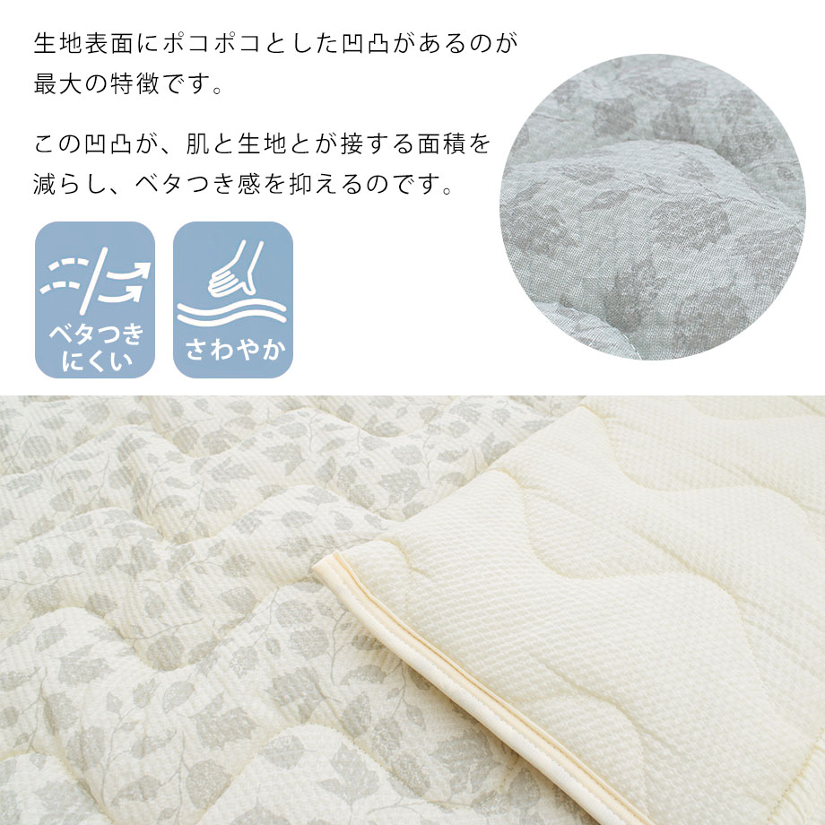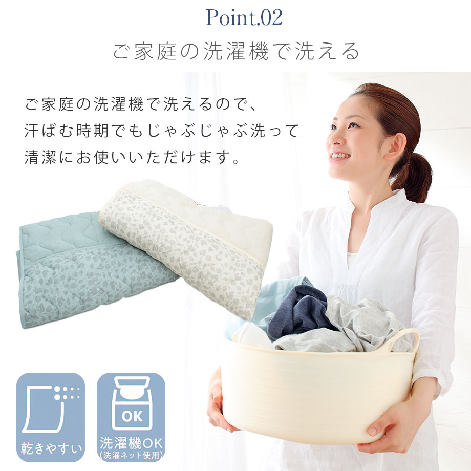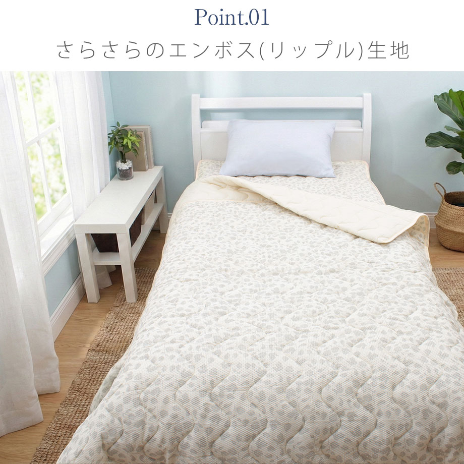 | ■ 毎日洗えて清潔! ご家庭の洗濯機で丸洗いOK。乾きやすい素材なので、汗をかきやすい夏場も気軽に洗えて、いつでも清潔・時短。 ■ 絶妙な「薄さ」と「軽さ」 重苦しさを感じない軽量設計。春・秋の季節の変わり目はもちろん、夏の冷房冷え対策にも最適です。 ■ 蒸れにくく、サラッと快適 両面ともにリップル加工を施した凹凸のある生地でさらすべ肌触り。 寝汗によるベタつきを軽減し、贅沢なリラックスタイムを演出します。 |