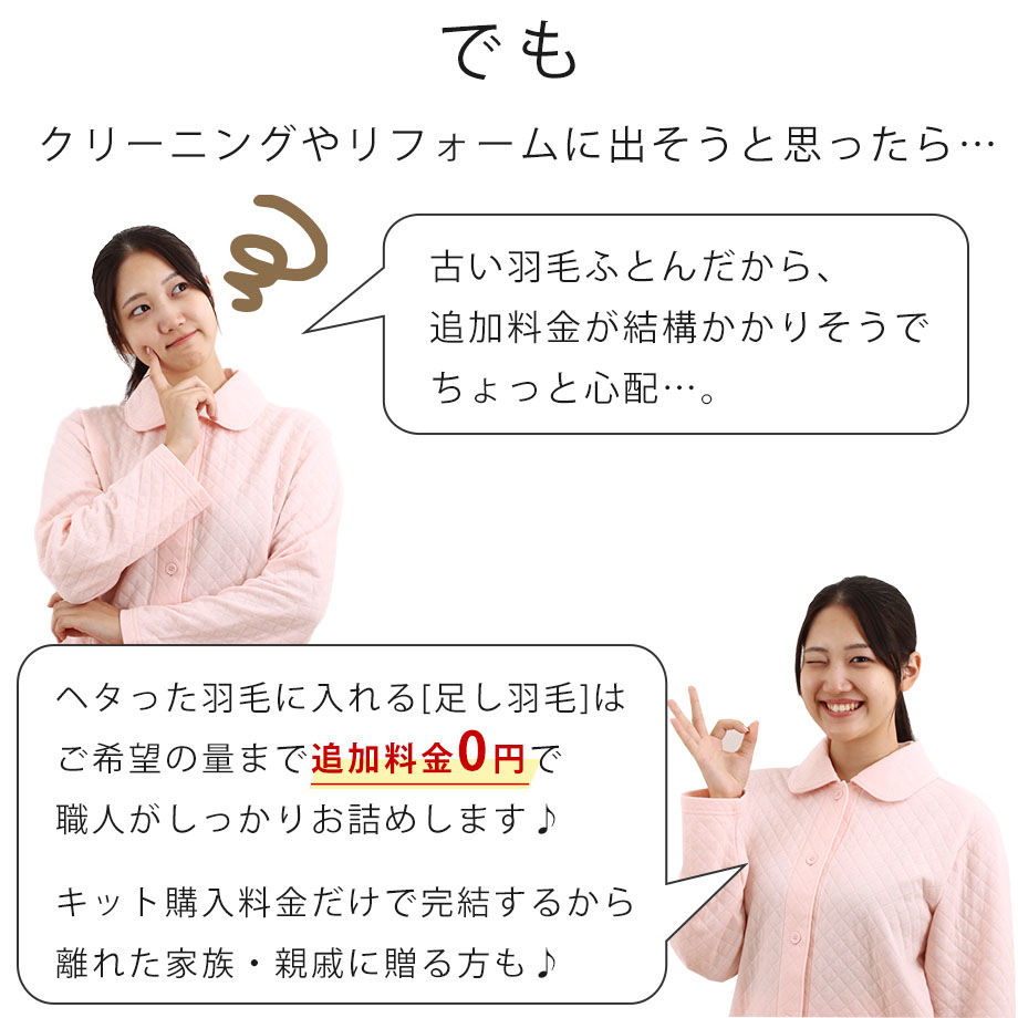 | A:羽毛厚掛布団(充填量1.0kg以上)、ダウン率85%以上の羽毛布団を推奨しております。 ご不明な場合、お手持ちの羽毛布団についた品質表示タグをご確認ください。 ご家庭の洗濯機で洗濯したふとん・わたふとん・ファイバー繊維など羽毛以外を接着/圧着/混合したふとん・羽毛合掛布団(充填量0.9kg以下)・羽毛肌掛布団・ダウンケット(夏用羽毛布団)はリフォーム対象外です。 品質表示タグが読み取れない場合、四つ折りに畳んだ時の高さが25cm以下のものは対象外とさせていただいております。 なお、対象外のおふとんをお送りいただいた場合、送料お客様ご負担の上で返送させていただきます。 |