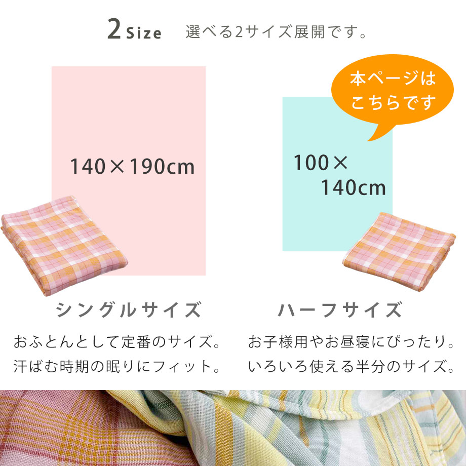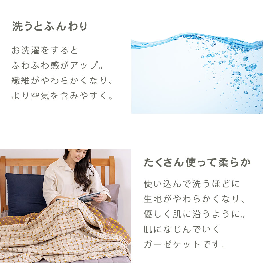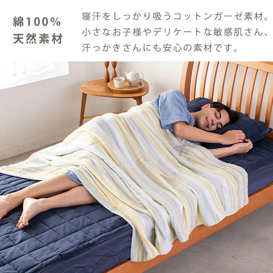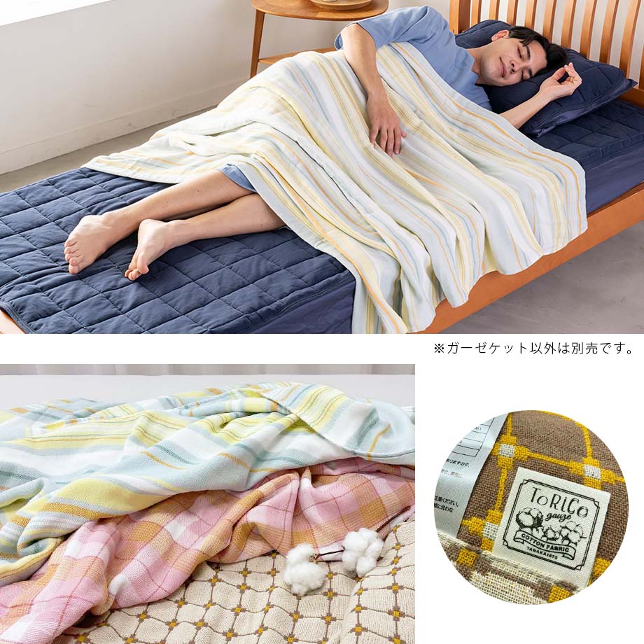 | とりこ5重ガーゼ生地を使用しているので、とても柔らかで優しい肌触りのガーゼケットです。 綿100%の5重ガーゼ生地は、湿気や寝汗を効率よく吸収し発散するのでいつもさらっとした肌ざわりです。 汗をかきやすい夏や湿気の多い梅雨の時期はもちろん一年中快適に過ごすことが出来ます。 丸洗いできるので手軽にお洗濯ができるのも嬉しいポイント。 ※掲載画像の色合いは、撮影状況やモニターの設定などの違いにより、実際の色合いと多少異なる場合がございますのであらかじめご了承ください。 |