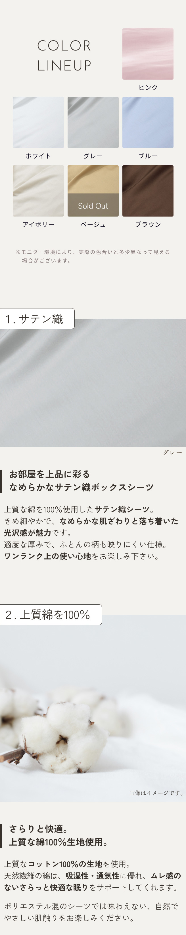 上質なコットン100%を使用したサテン織りのボックスシーツ。きめ細やかで滑らかな肌ざわりが魅力。落ち着いた上品な光沢があります。