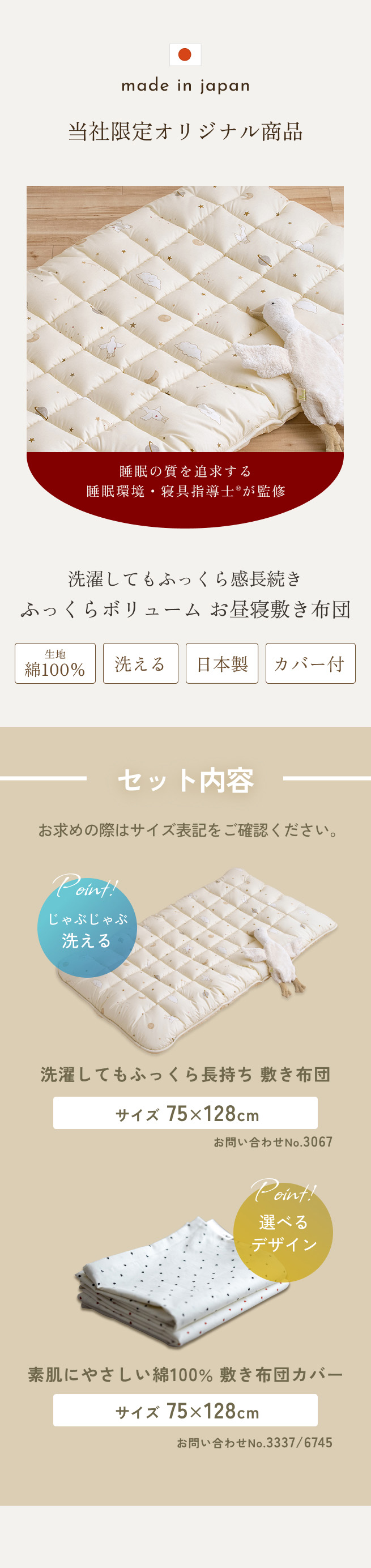 うれしい大きめサイズ!ゆったり眠れます!成長してもゆったりお昼寝ができるように『75×128cm』サイズにしました。足が出てしまってかわいそう〜なんてことのないように、お子様の成長に合わせてお選びください。