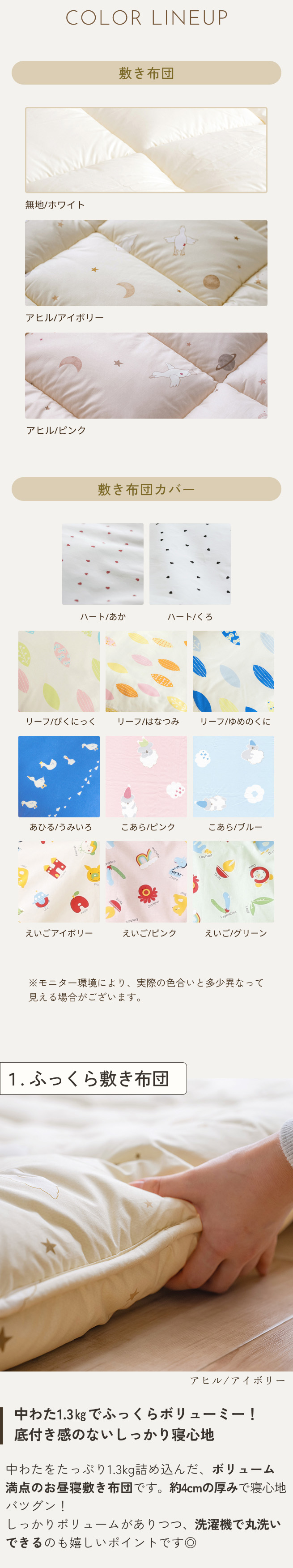 大切なお子様のために『安心のお昼寝敷きふとん』をお届けします!1.お昼寝敷き布団サイズ:75cm×128cm 中わた重量:1.3kg ご家庭の洗濯機で手軽に洗える!お子様に清潔で快適な寝具環境を!寝汗をかいたり、おねしょをしたりと何かと汚れがちなお子様のお昼寝布団ですが、これなら安心!ご家庭の洗濯機で洗えます!『眠る』ことは、成長期の子どもにとって大切な要素!毎日のお昼寝を快適に心地よくしてあげましょう。