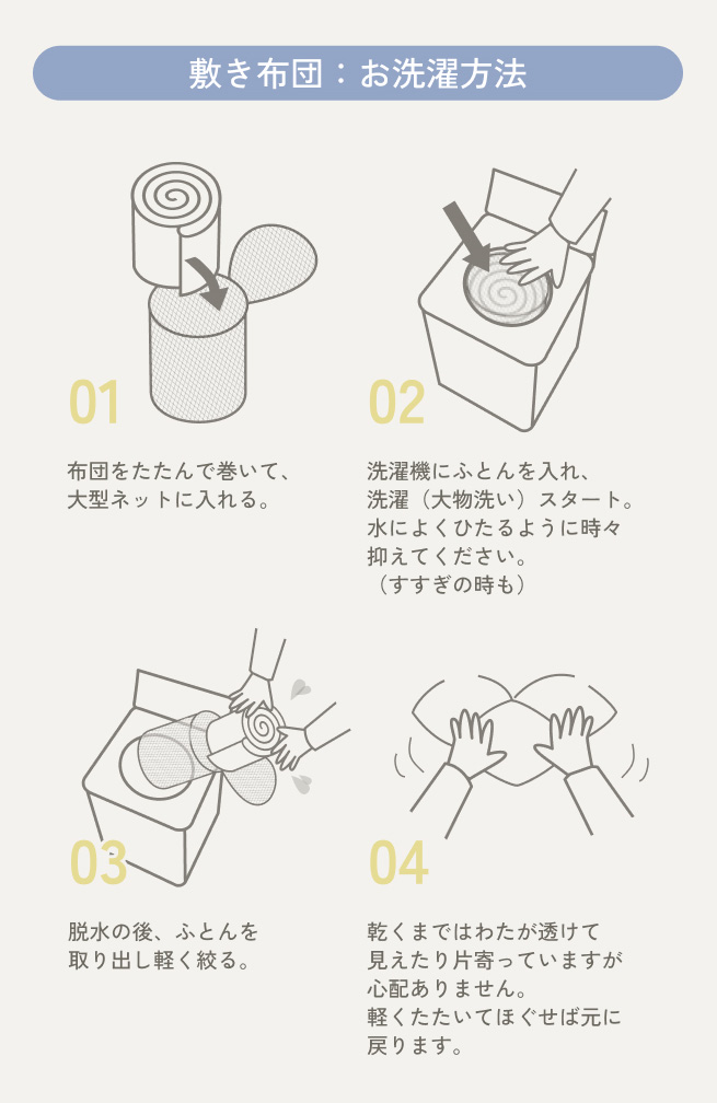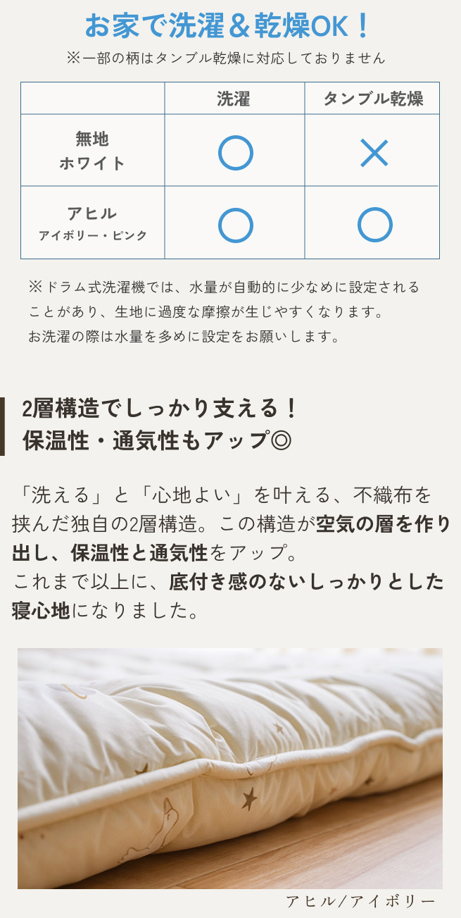 2層式で寝心地しっかり!保温性、通気性さらにアップ!中綿を表地と裏地で挟んだ1層式では厚さがでません。1層では薄すぎてベッドパッドのような寝心地。フローリングで使用すると床つき感があります。洗える中わたを使用しつつ、寝心地にもこだわった結果、2層タイプの敷き布団になりました。寝心地だけでなく、2層にすることで空気の層ができ、保温性もアップ↑通気性もアップ↑快適な寝床内環境が整えられます。