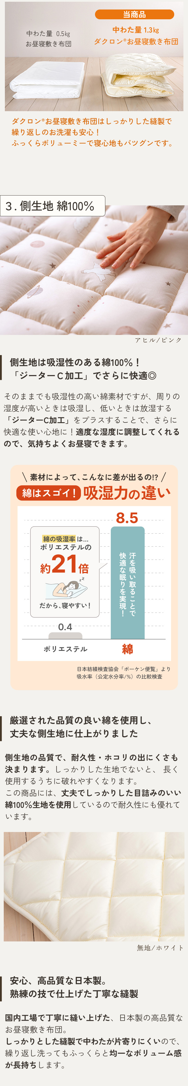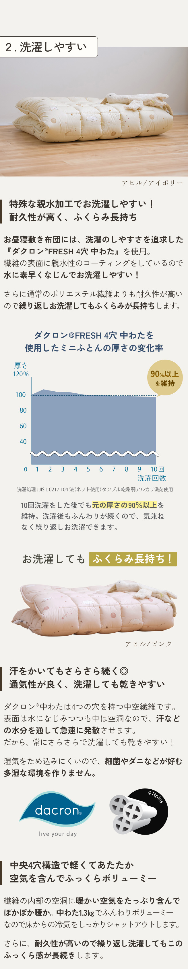 繰り返しの洗濯に強い!だから長持ち!ダクロン(R) 中わたは繰り返し洗濯をしてもへたりにくいという特長があります。お昼寝敷き布団はとにかく汚れがち。よだれだったりおねしょだったり。汚れるたびにきれいに洗って清潔に気持ちよくしてあげたいですよね。3年〜4年使うことを考えると、洗濯に強くてへたりにくい敷き布団がおすすめなんです。