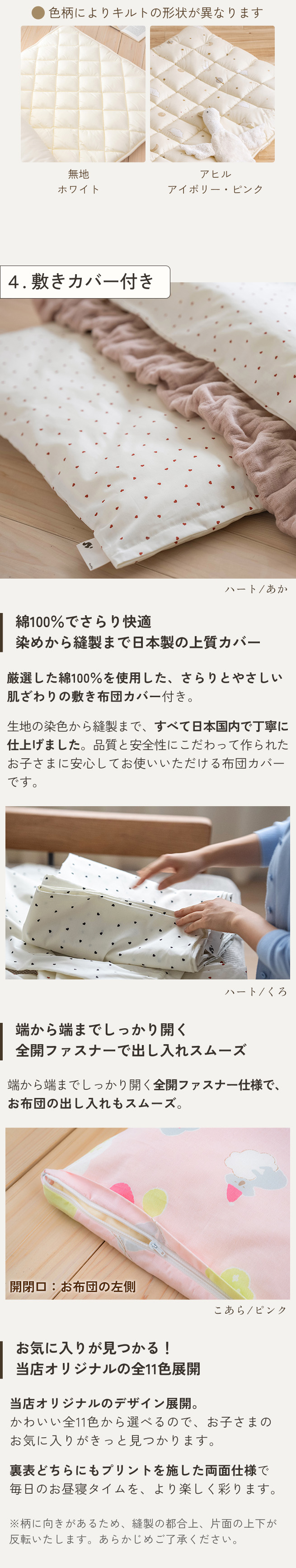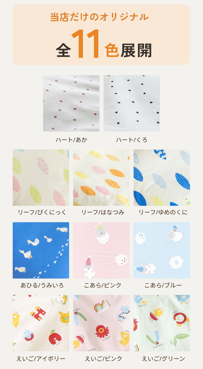 生地の染めにもこだわりました! 大切なお子様が毎日のように使うお昼寝ふとん。特にカバーは肌に直接触れますから、こだわりたいポイントです!こちらの生地のプリントには染料を使用しているため、 ゴワゴワ感がなく柔らかでお子様の肌にやさしい仕様!安心品質のカバーで、お子様の健やかな眠りをサポートしましょう。