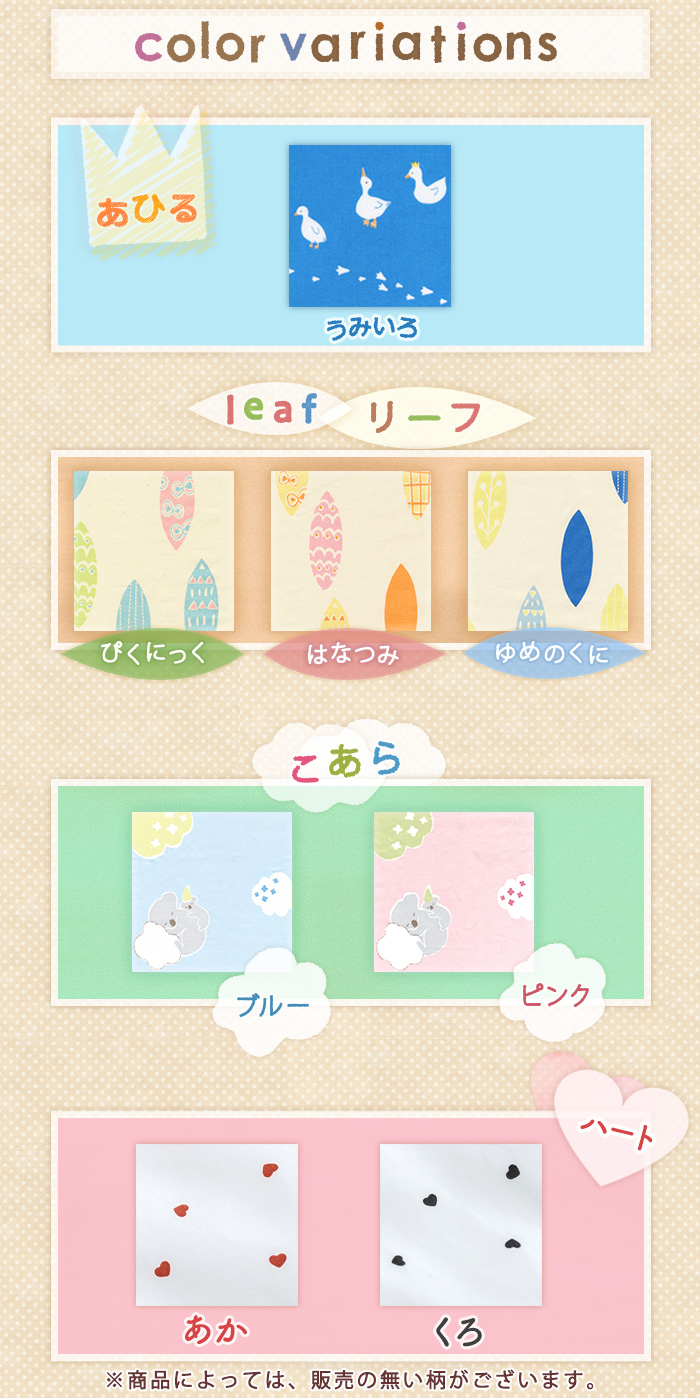 ・あひる柄は、生地変更のためサイズにより、色・柄・生地が若干異なります。