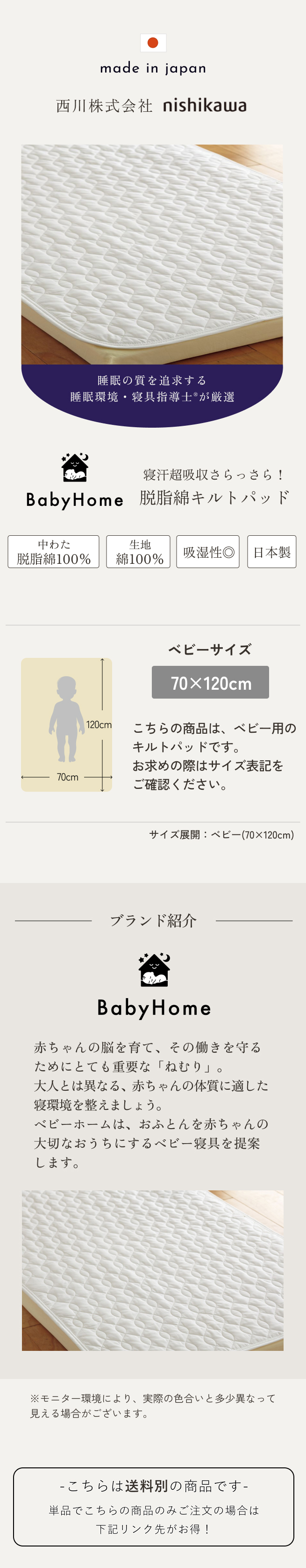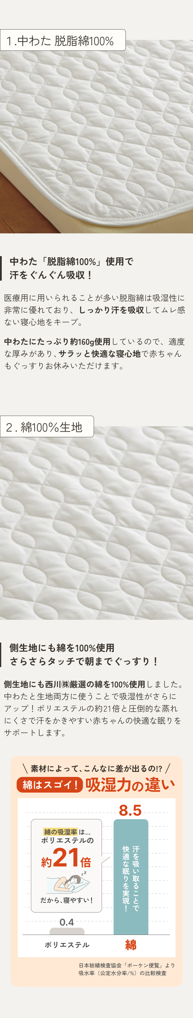 ◆商品名:ベビー 敷きパッド 西川 日本製 ベビー用 脱脂綿 キルトパッド