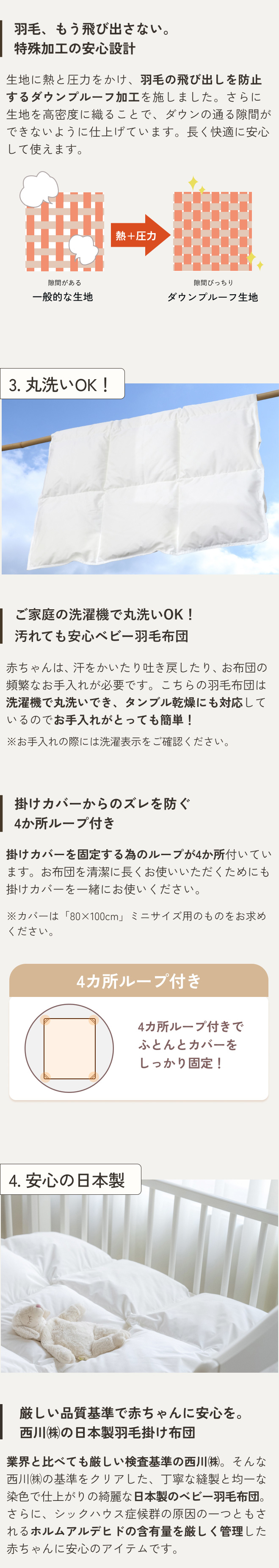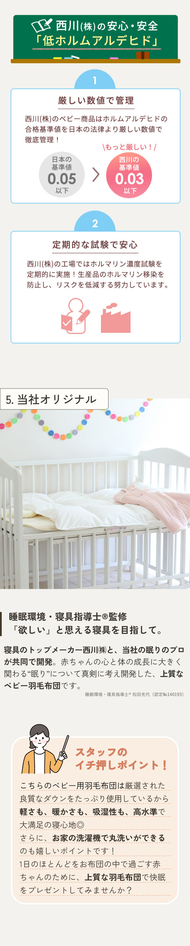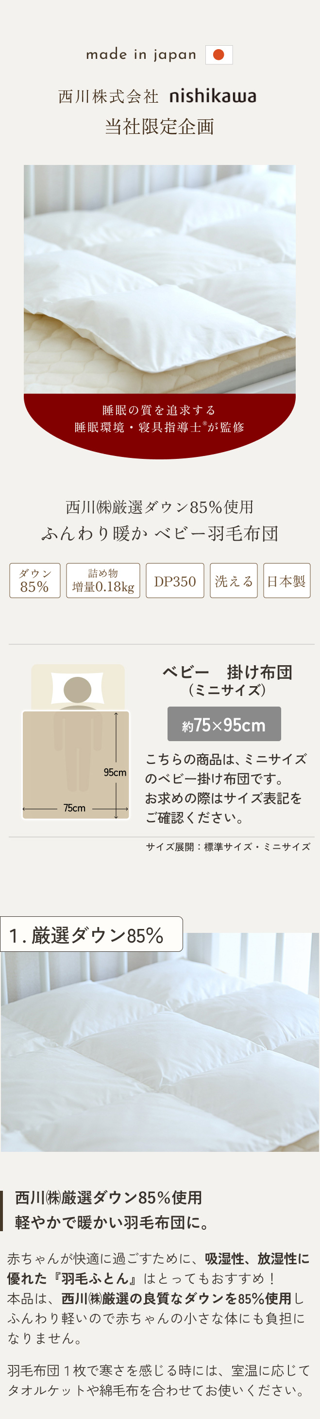ベビー布団 羽毛布団 ミニ 75×95cm 洗える タンブル乾燥対応 西川 掛け布団 ダウン85% 日本製 赤ちゃん ベビー