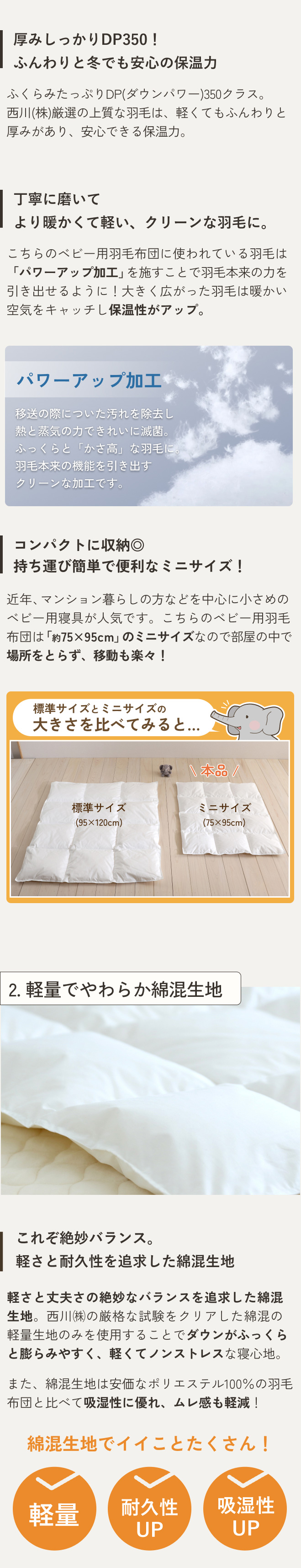 ◆商品名:ベビー羽毛布団 ミニ 羽毛布団 西川 掛け布団 厳選ダウン85%