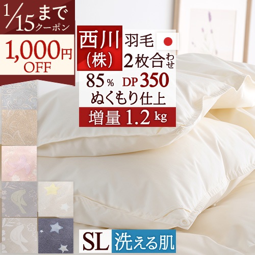 羽毛布団 西川 シングル 2枚合わせ 増量1.2kg 抗菌 洗える 85% DP350 日本製 リビング 羽毛掛け布団 オールシーズン