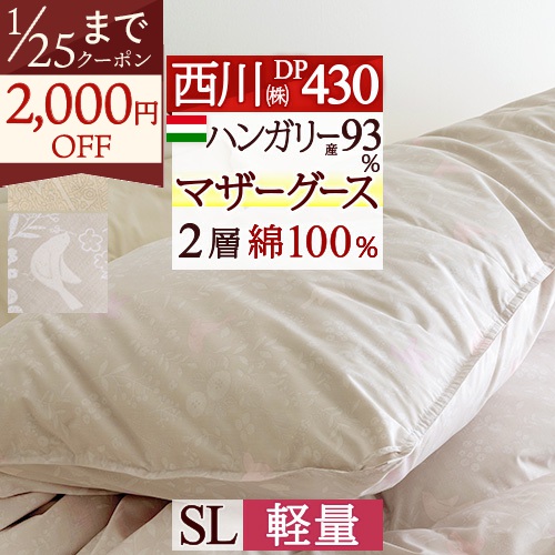 羽毛布団 シングル 東京 西川 マザーグース ダウン93% ハンガリー産 DP430 グース 軽量1.1kg 2層式キルト 抗菌 超長綿 綿100% 西川 日本製