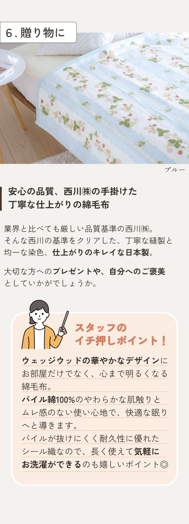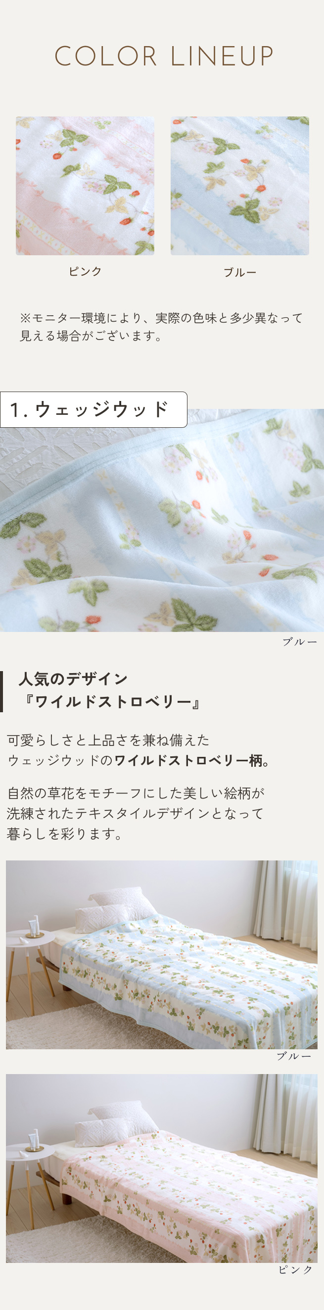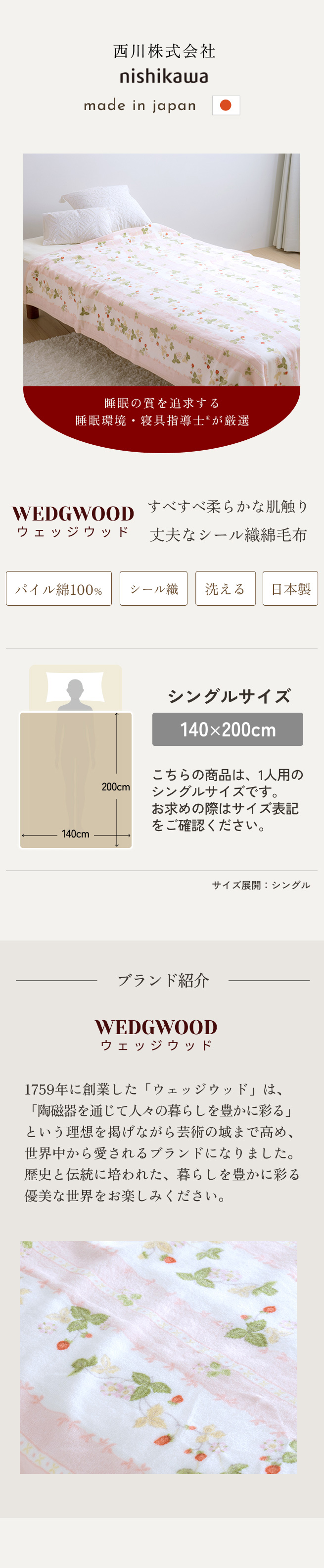 ポイント10倍 西川 シール織綿毛布 ウェッジウッド ワイルドストロベリー シングル 東京西川 西川産業 日本製 ブランケット パイル部分綿100% ウ