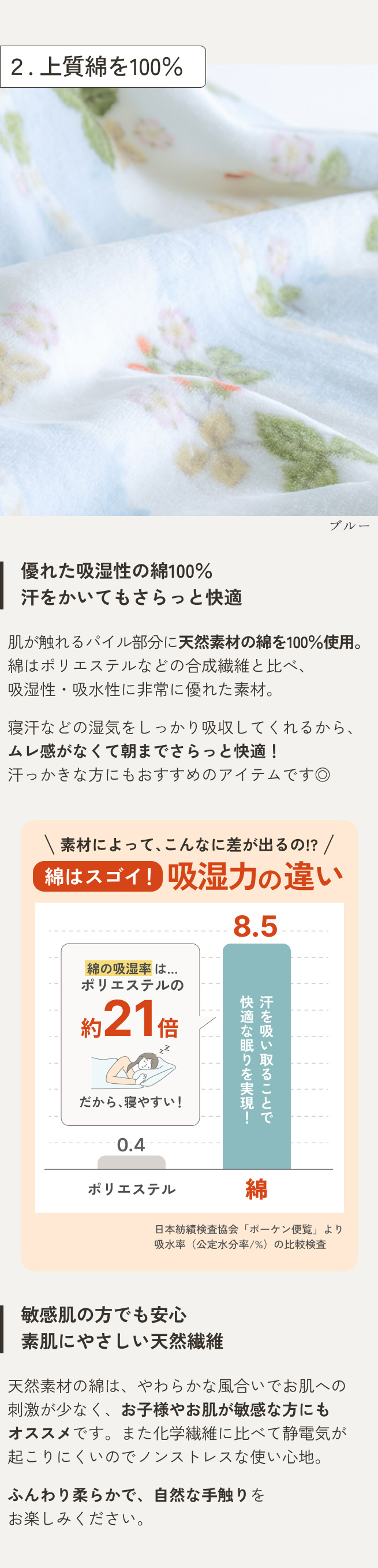 アクリル等の化繊と比べ、パイルが綿素材の毛布は吸湿性が高いため、湿気がこもらず、さらっと快適な使用感。汗っかきの方やお肌の敏感な方におススメの毛布です。柔らかな肌触りとムレ感のない快適さで、寝床内温度を快適に保ってくれます。
