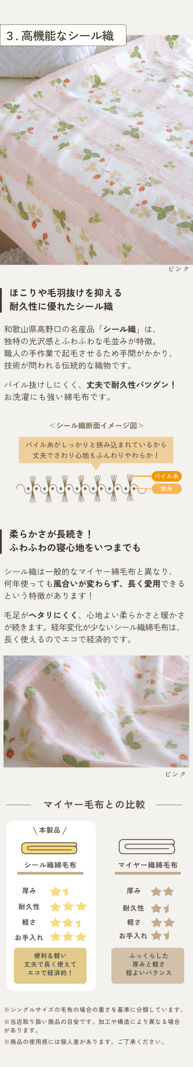 ご家庭でかんたんに洗えますから、お手入れ簡単。らくらくとお洗濯できる綿毛布だからこそ、繰り返しのお洗濯にも耐えられる「しっかりと丈夫」な製品がおすすめ!