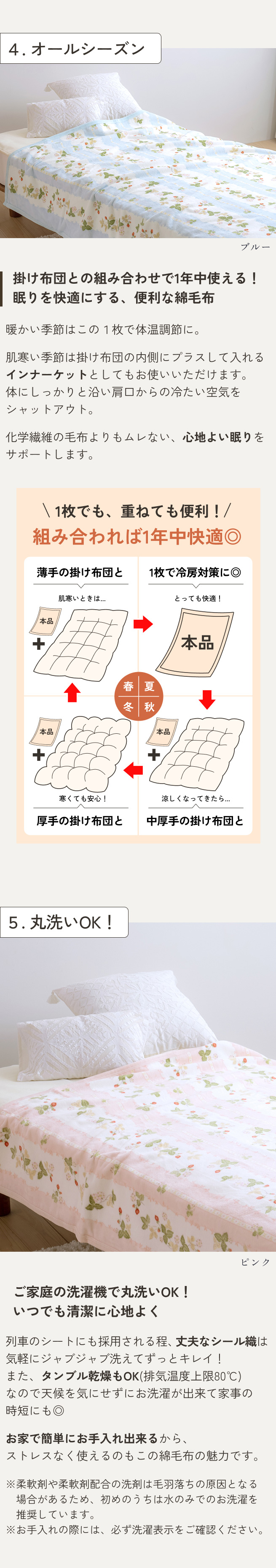 綿毛布は、軽くてフィット性もよく、オールシーズンお使い頂ける優れものです。 冬場は羽毛掛け布団の内側にお使いいただくと、お布団に入った時のヒヤッと感が軽減。夏場は冷房による身体の冷えすぎから、やさしく守ってくれます。1年中活躍してくれるとっても便利なアイテムです。