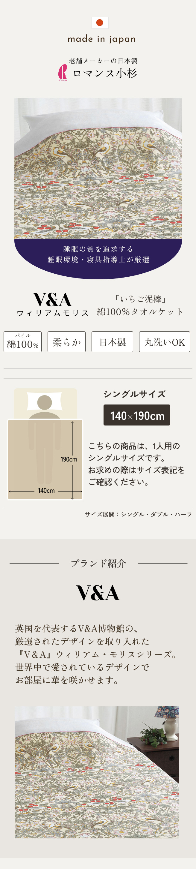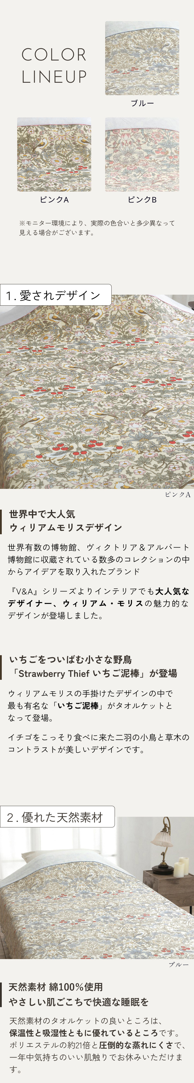 ◆商品名:タオルケット シングル ロマンス小杉 V&A ウィリアム・モリス 日本製 洗える いちご泥棒