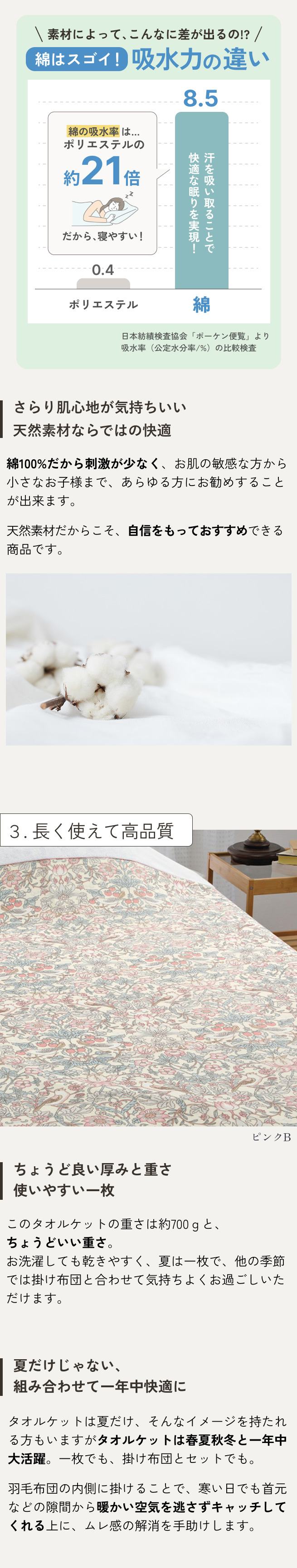 肌に触れる面は吸湿性に優れた綿100%。吸湿性に優れた綿100%素材が、汗や湿気をしっかり吸収。代謝の高い方やお子様には、天然繊維『綿』がおすすめ。暑くて寝苦しい夜もぐっすり。