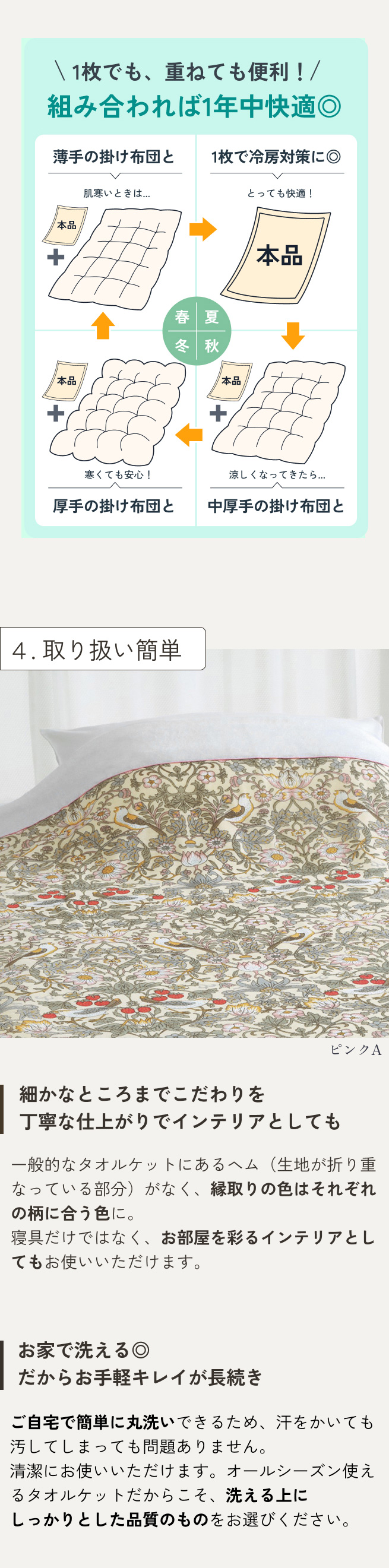 夏はもちろん、冬は毛布代わりとして羽毛布団と一緒に使います。冬のお布団の中のムレ感を解消してくれますので、定評のある使い方の一つです。