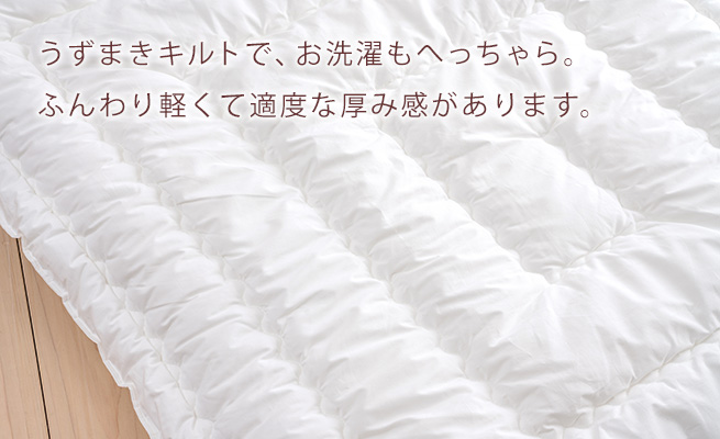ご家庭の洗濯機でお手軽に洗えます。ぐるぐるのうずまきキルトできちんと中綿を固定しているから、中綿が片寄りにくく、繰り返しのお洗濯もへっちゃら。このキルトの工夫により、わた切れしにくく、ほこりがでにくい仕様なので日本アトピー協会の推薦品にも選ばれています。