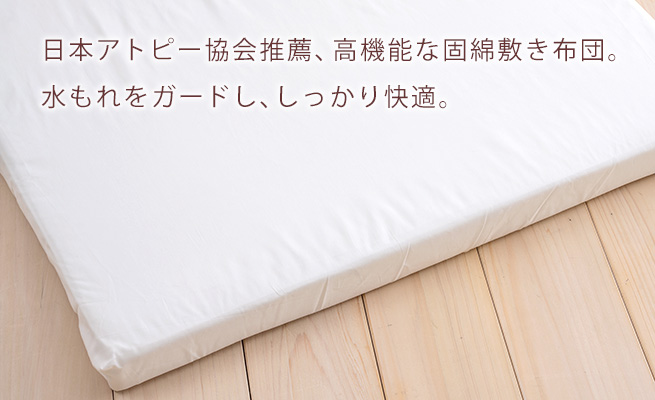 赤ちゃんは大人の2〜3倍もの汗をかきます。また、おむつ交換で失敗することも。こちらの固綿敷き布団は、上層部の吸水ポリエステルが水分をしっかり吸収。そして、下層部でしっかり撥水するので、寝床への水分の浸透を防いでくれます。