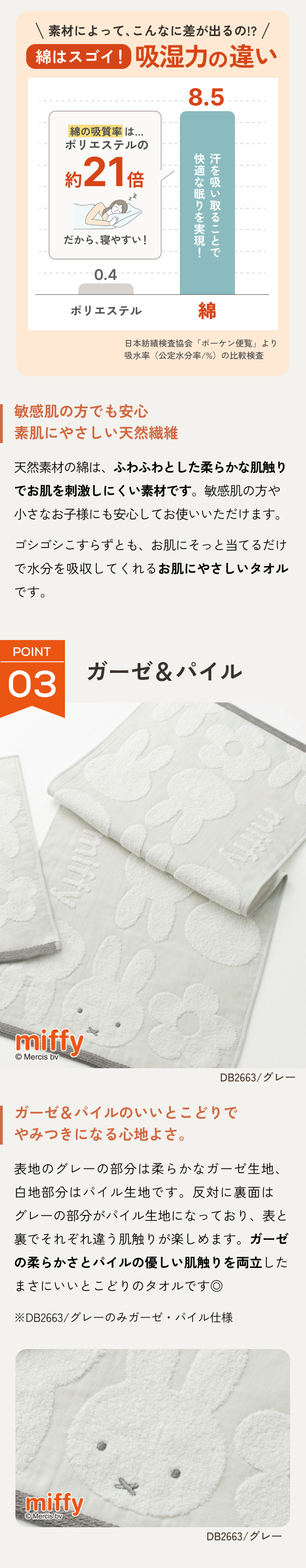 表地のグレーの部分はやわらかなガーゼ生地、白地部分はパイル生地になっています。逆に裏面はグレーの部分がパイル生地になっており、表と裏でそれぞれ違う肌触りが楽しめます。パイルのやわらかさとガーゼのやさしい肌触りを両立した、まさにいいとこどりのタオルです。