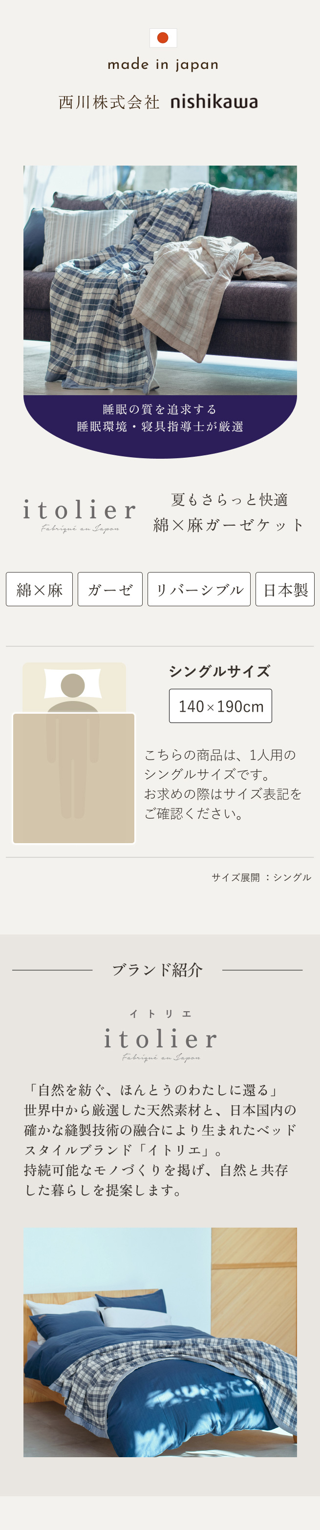 ガーゼケット シングル 日本製 西川 itolier イトリエ 麻混 リバーシブル ガーゼケット 高野口 夏 涼しい 軽い 薄手 シングルサイズ