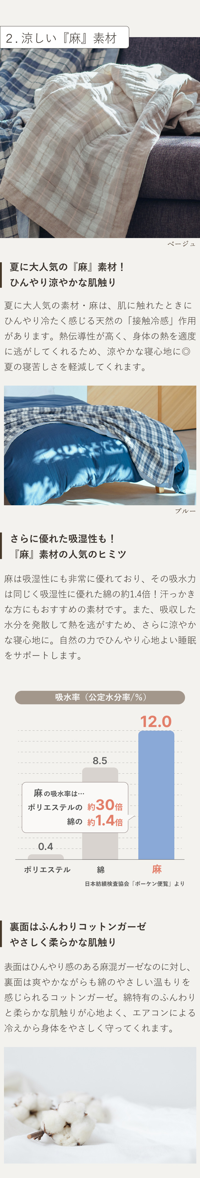 麻は、肌に触れたときに冷感があり、カラッと爽やか。べたつかず、シャリシャリとした肌触りが特徴。しかも綿の何と1.4倍もの吸水力。綿100%のタオルケットよりもさらに吸湿性に優れているので、汗かきの方にお勧めです。また、水分を吸収、発散することで、熱を逃がし、自然の力でヒンヤリと涼しくします。