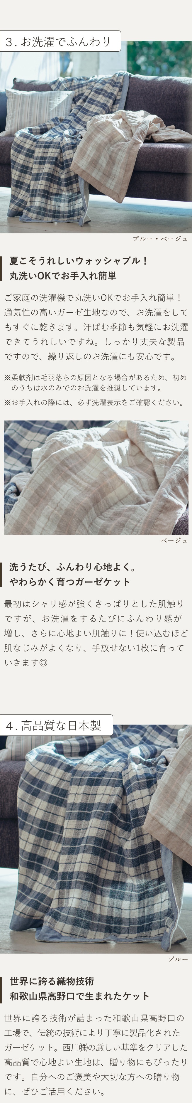 世界に誇る技術が詰まった高野口の工場で、伝統の技を駆使し、1枚1枚丁寧に製品化されています。より心地よくお使いいただくために丁寧な加工を施し、上質の日本製のガーゼケットをお届けしております。