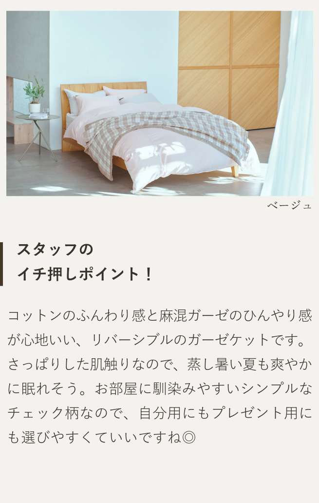 表面は夏場に適した素材の麻混のガーゼを使用。裏面は綿のガーゼ仕上げ。お好みの質感・肌触りに合わせて使用できるリバーシブルタイプです。