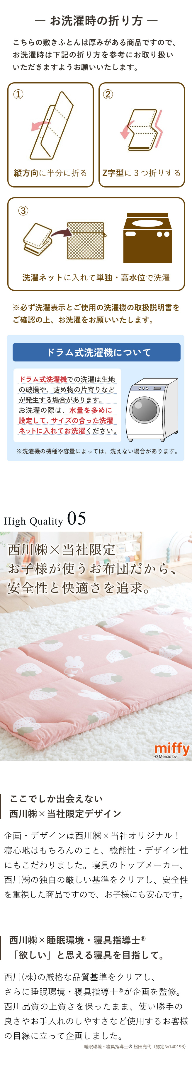 お昼寝敷き布団 ミッフィー miffy いちご 西川 綿100%生地 保育園 幼稚園 洗える 固綿入り お昼寝マット ごろ寝マット お昼寝用 敷布団 お昼寝敷布団 67×
