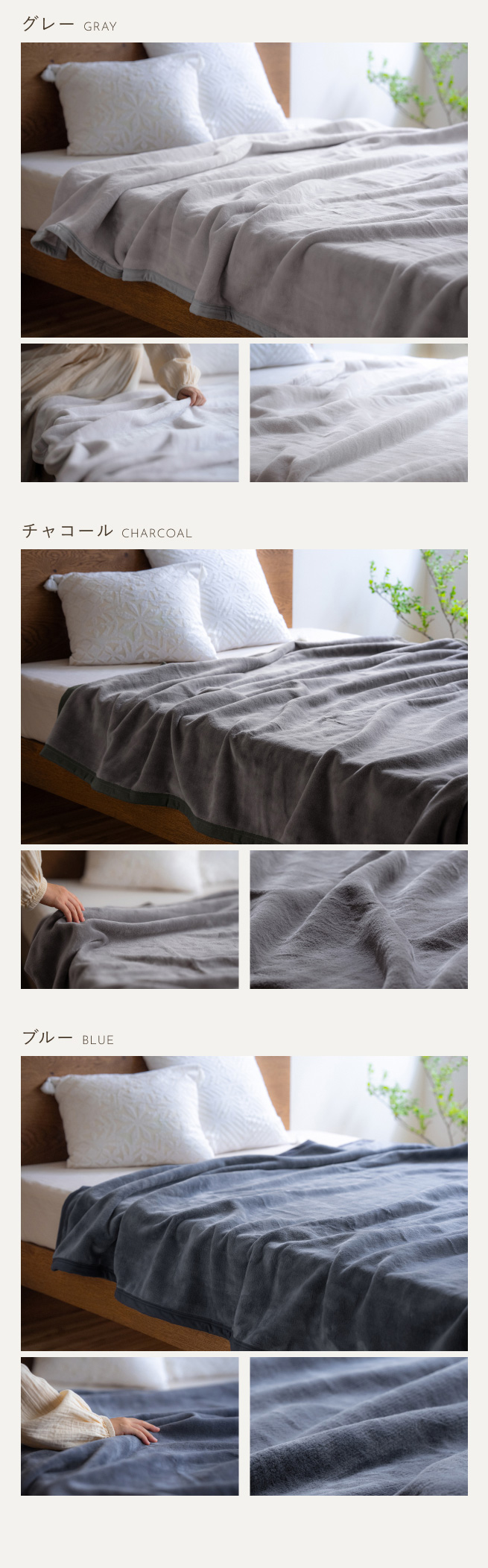 毛羽部分は綿100%使用。アクリル等の化繊と比べ、綿は吸湿性が高いため、湿気がこもらず、さらっと快適な使用感。 汗っかきの方やお肌の敏感な方におススメの毛布です。柔らかな肌触りとムレ感のない快適さで、1枚あるとオールシーズン使えてしまう便利アイテム!