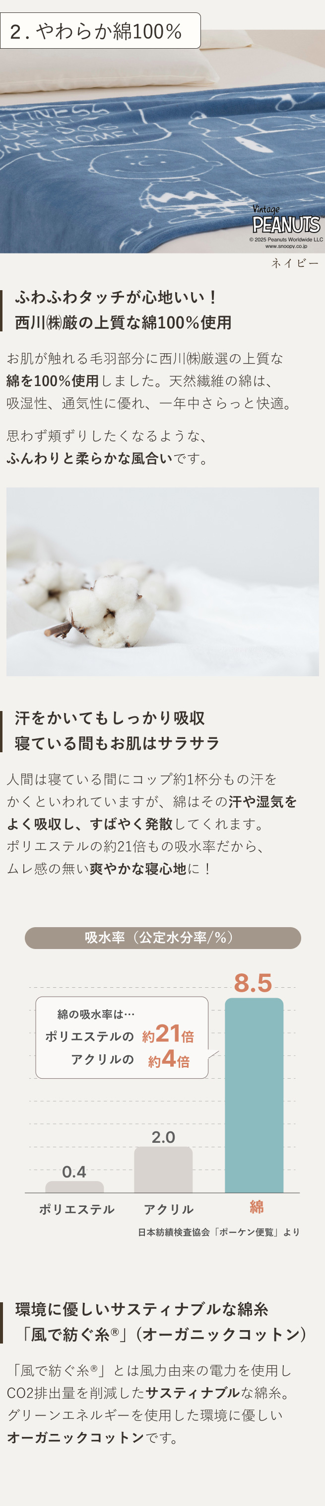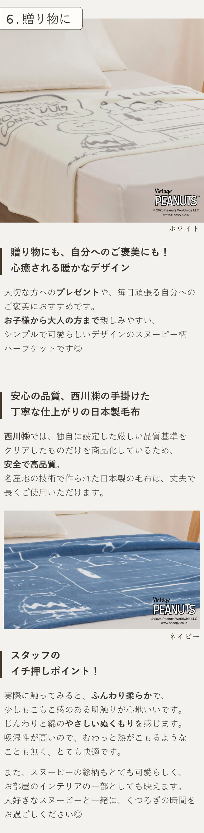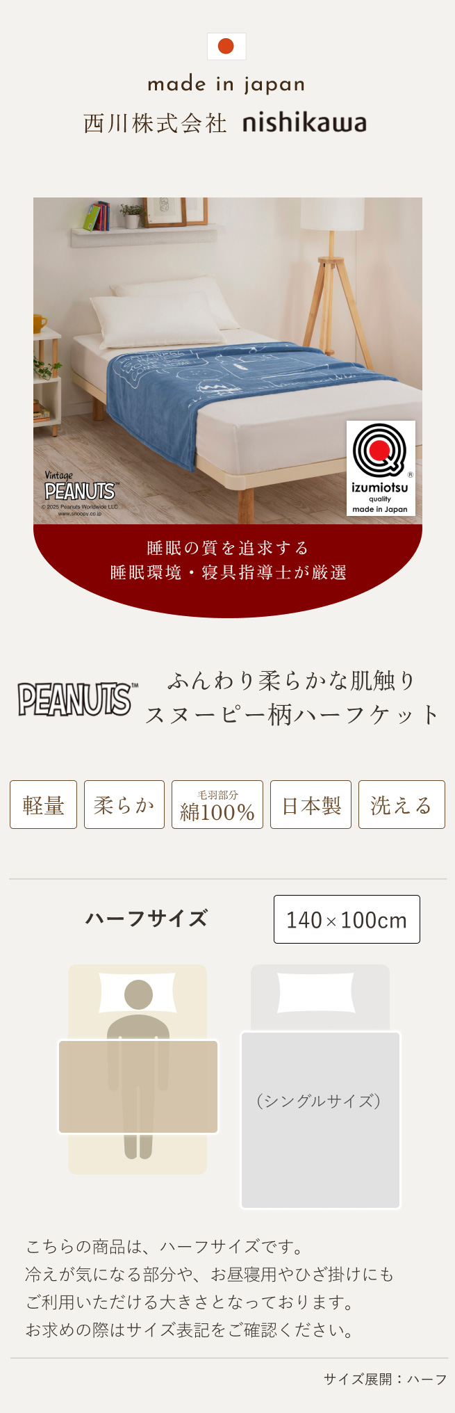 綿毛布 ハーフサイズ ひざ掛け ハーフケット スヌーピー 140×100cm 西川 オーガニックコットン 綿100% 日本製 キャラクター お昼寝 snoopy 保育園 幼稚園