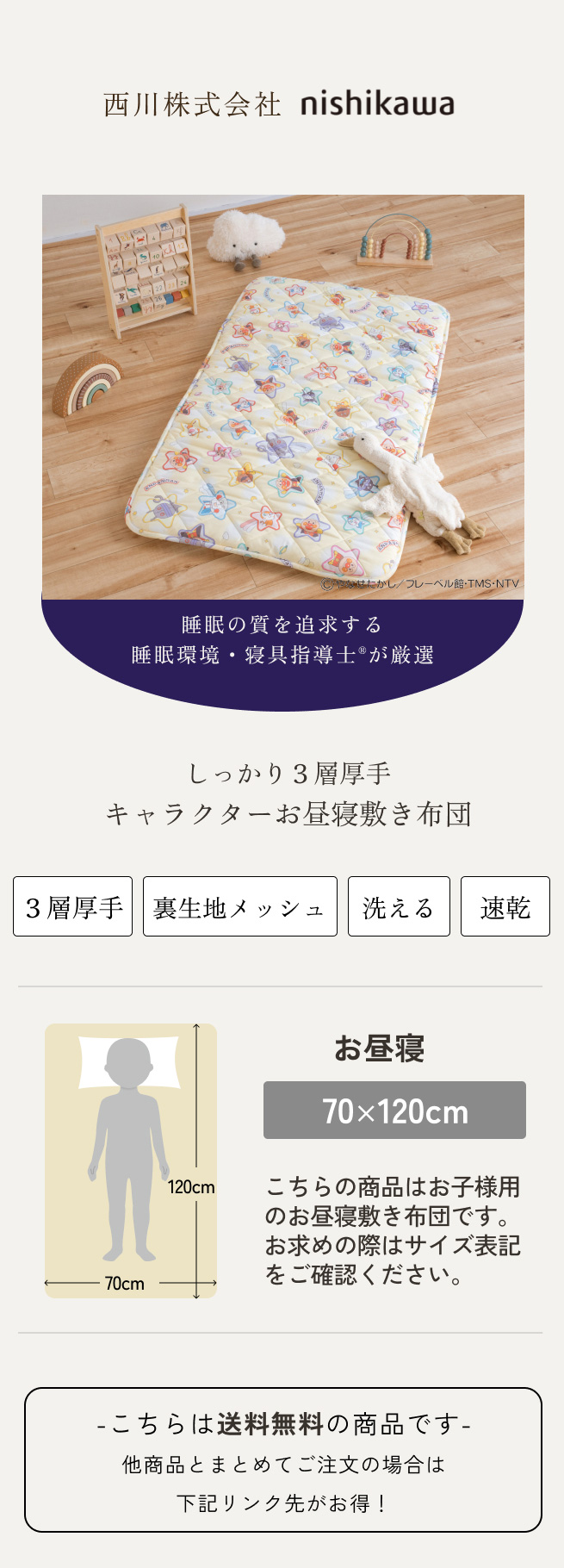 お昼寝マット アンパンマン トーマス 子供 敷き布団 保育園 幼稚園のお昼寝に お昼寝敷き布団 西川 東京西川 西川 合繊 70×120cm 送料無料