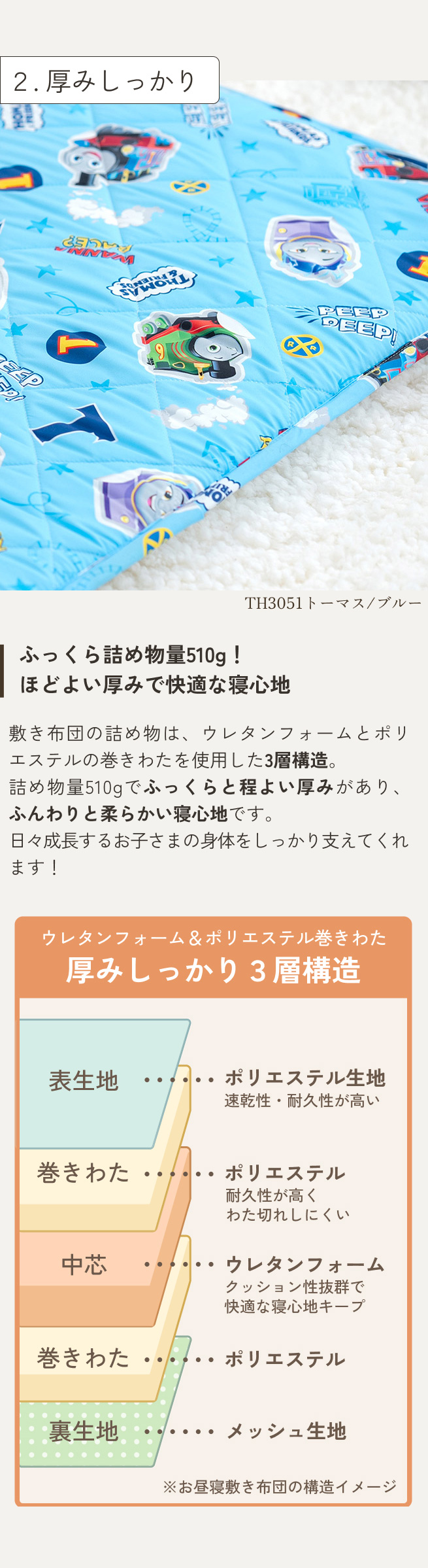 敷布団の詰め物は、ウレタンフォームと巻きワタを使用した三層構造。ふっくらと程よい厚みがあり、ふんわりと柔らかい寝心地です。お昼寝用の敷布団にはかなり薄めなものもありますが、寝心地や快適性を重視しました。