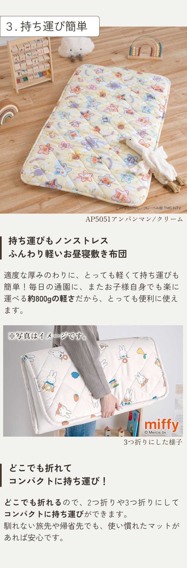 3つ折りにでき、コンパクトに持ち運べます。馴れない旅先や帰省先でも、使い慣れたマットがあれば安心です。