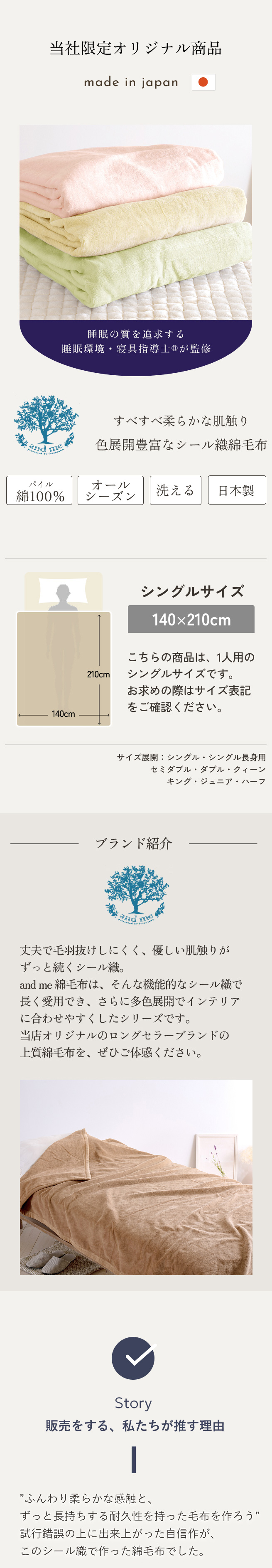ゆったりがうれしい、210cm丈長さが200cmのものが多い中、こちらの綿毛布は長さ210cm!ロングサイズだからゆったり。長身の方にもおすすめのサイズに仕上げました。