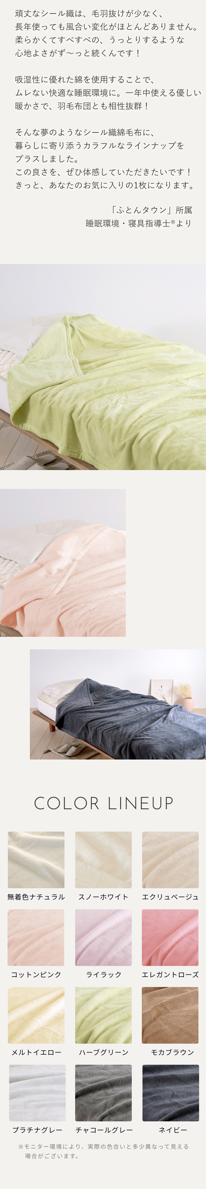 オールシーズン使えるコットンケットシール織りの綿毛布は、軽くてフィット性もよく、オールシーズンお使い頂ける優れものです。