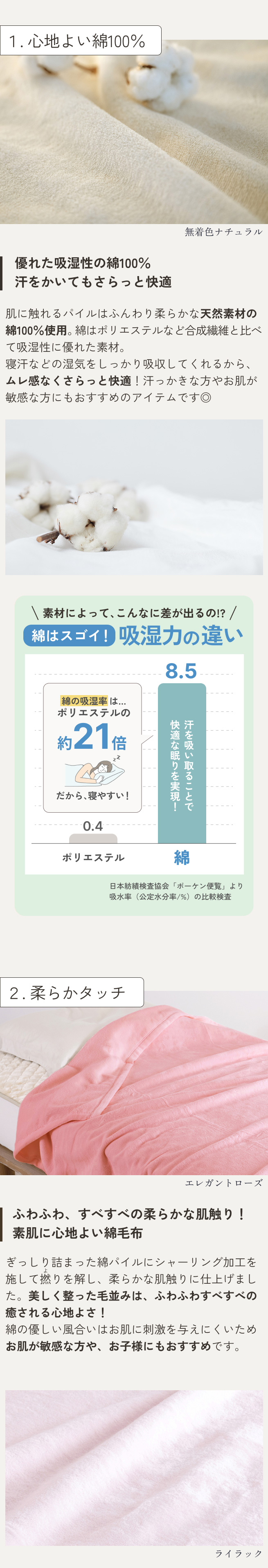 吸湿性抜群のパイル綿100%肌に触れる部分はコットン100%。天然繊維の綿は、吸湿性、通気性、保温性に優れ、夏はサラッと冬はふんわり適度な保温力。お肌にやさしいナチュラルな肌ざわりとポリエステルやアクリルなどの化繊の毛布では味わえない心地よい暖かさがあります。